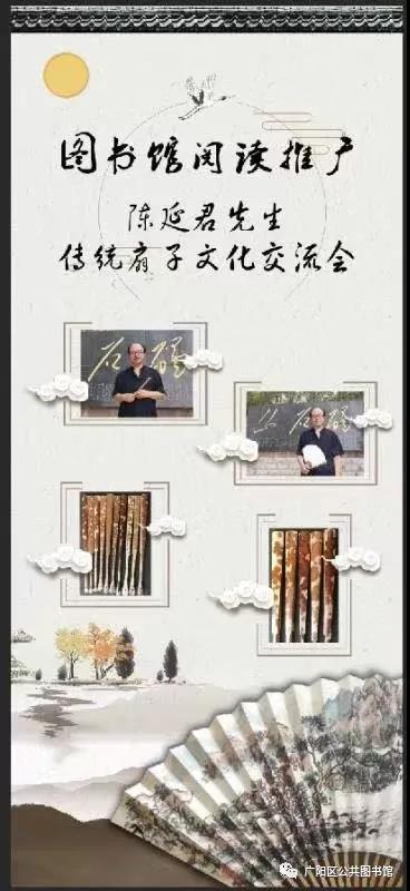 广阳区公共图书馆定于2018年12月16日(星期日)下午2.00,在三楼宣讲室开展阅读推广——扇子收藏与鉴赏。本次阅读推广特邀扇子收藏家陈延君先生为读者和市民零距离讲解扇子的收藏。陈延君先生多年来对传统扇子在制作、使用、收藏、鉴赏等方面有很全面的造诣和独到的理解扇子的收藏和使用历史悠久,文人雅士赋予了深厚的内涵。图书馆邀请广大读者和市民前来免费参加此次阅读推广活动。虚位以待,送您周末一次优雅的文化之旅。