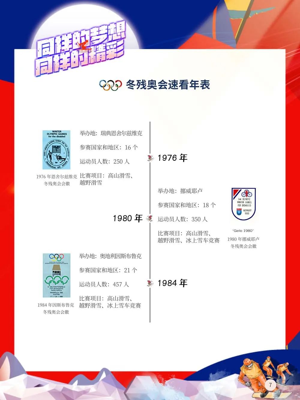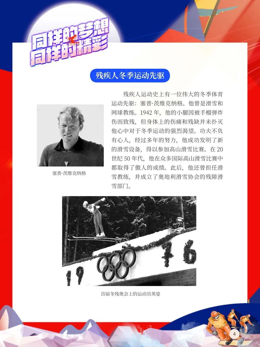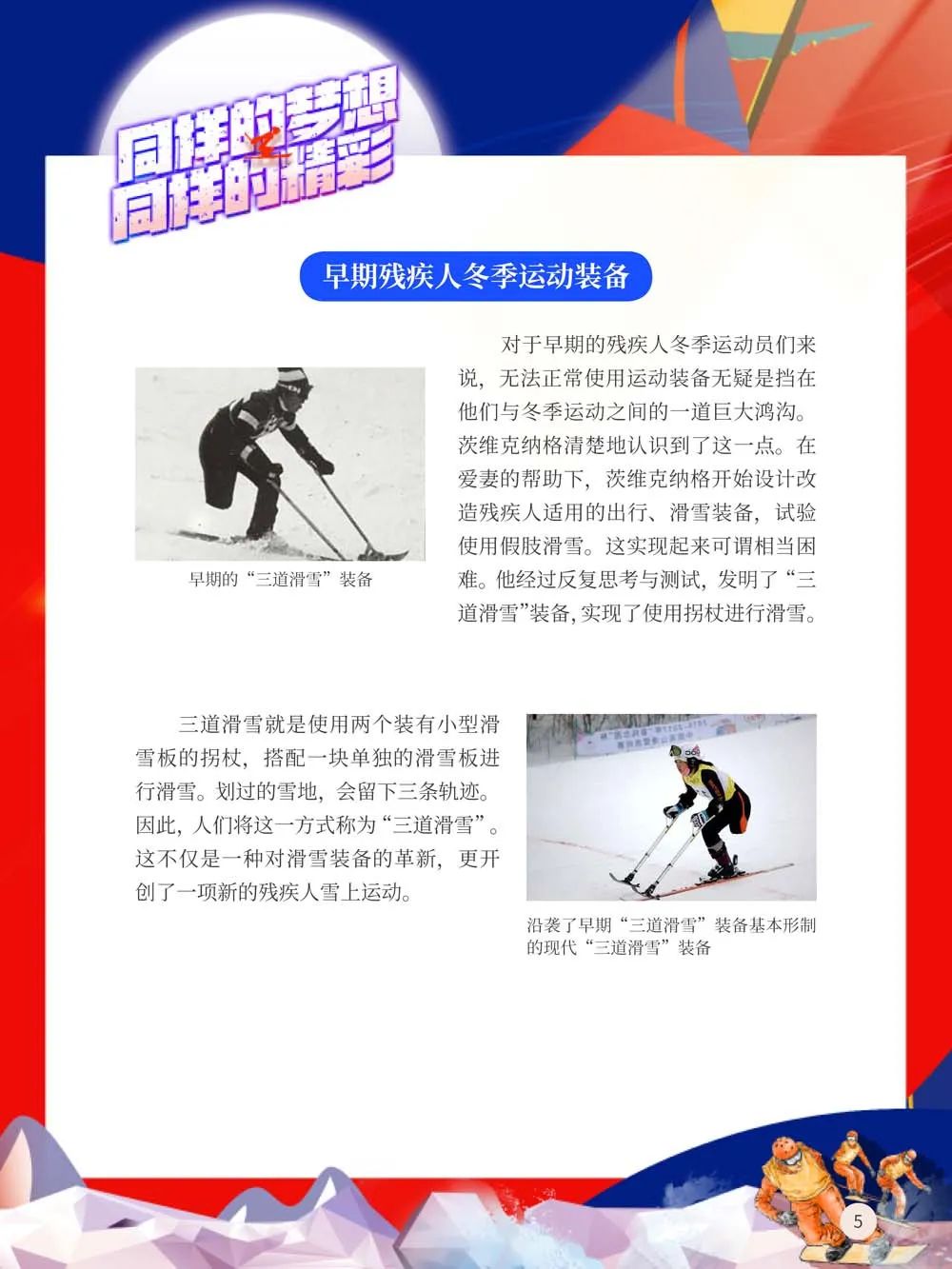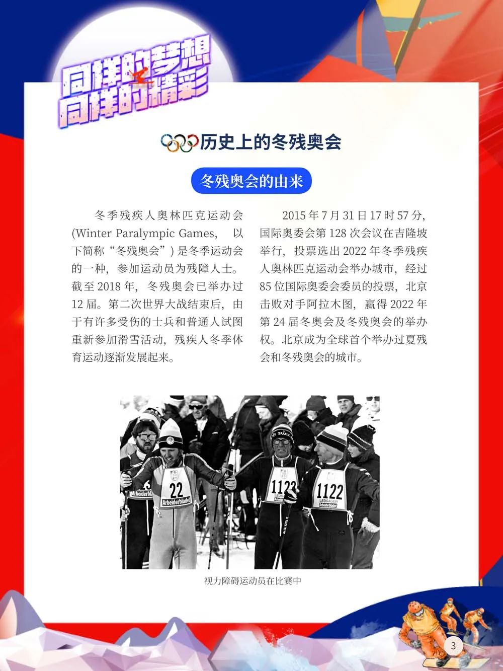 运动对于残疾人的意义,远远超越运动本身。而残奥会为全世界残疾人士提供了一个公平竞技的平台,一个承载梦想的平台,一个超越自我、成就自我的平台,一个倡导和践行“残疾人与健全人同属一个世界”理念的平台。他们虽身体有残缺,但对于梦想的热爱与执着却从不曾更改!值此盛典开幕之际,我们特别推出“同样的梦想,同样的精彩——冬季残疾人奥林匹克运动会科普展”,带领读者了解冬残奥,以及冬季残疾人冰雪运动。