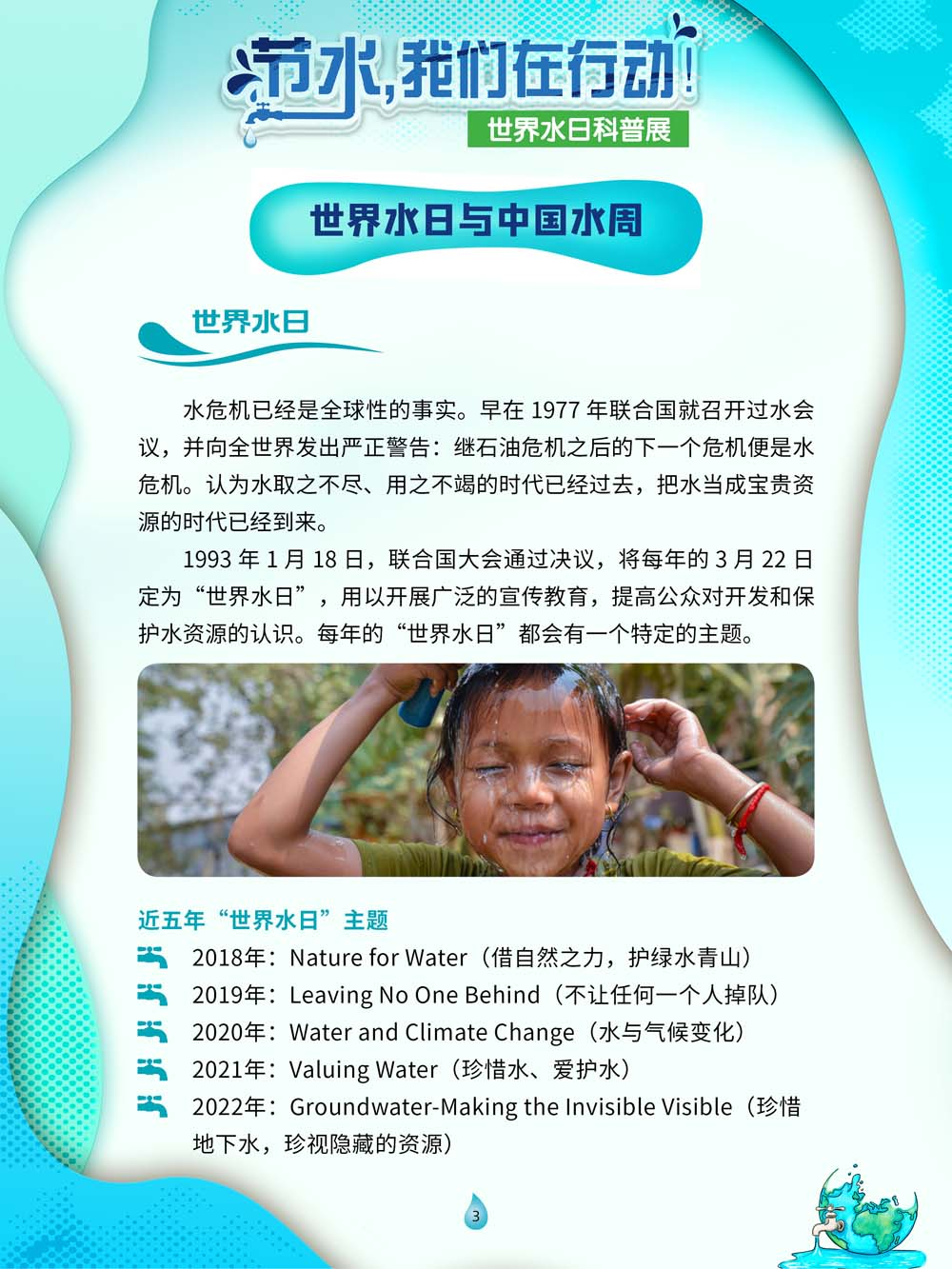 2022年3月22日是第三十届“世界水日”,3月22—28日是第三十五届“中国水周”。为了迎接世界水日和中国水周的到来,我们策划了本场科普展,希望帮助大家培养节水意识,养成良好的节水习惯,以举手之劳共同守护我们的生命之源。
