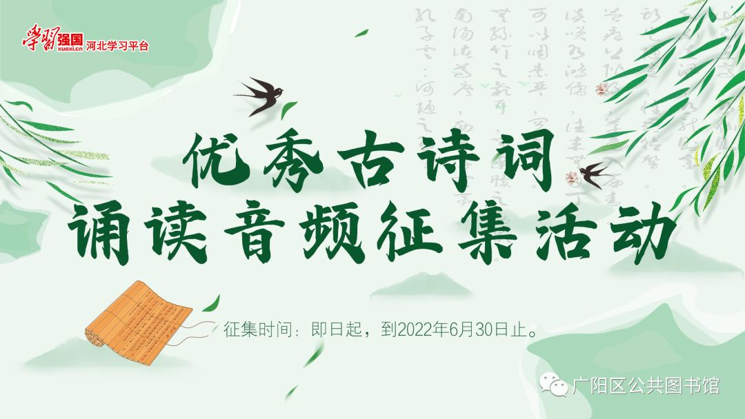 中华优秀古诗词是我国传统文化的精粹,凝聚着民族精神,也体现了时代风貌。习近平总书记指出,“古诗文经典已融入中华民族的血脉,成了我们的基因”“语文课应该学古诗文经典,把中华民族优秀传统文化不断传承下去”。为进一步传承弘扬中华优秀传统文化,“学习强国”河北学习平台联合全省11家市级学习平台和雄安新区、定州市、辛集市“学习强国”工作专班,组织开展“学习强国”优秀古诗词诵读音频征集活动,邀请热爱古诗词的你们,通过诵读的形式,感受和分享中华诗词的文化魅力和精神力量。