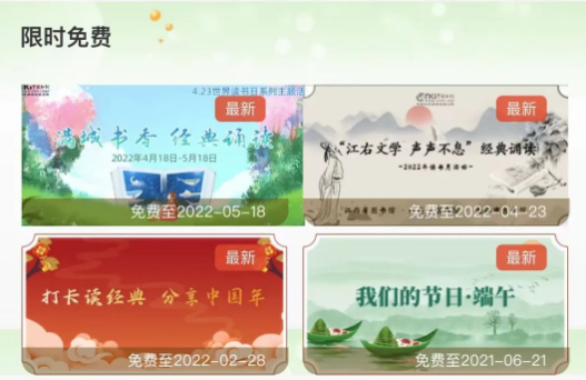 进入《畅知经典诵读》平台后下滑页面,找到【限时免费】模块,点击最新栏目“满城书香 经典诵读”进入后,即可选择诵读的读本。