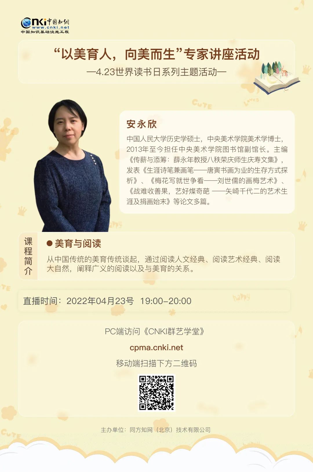 第一讲美育与阅读-《CNKI群艺学堂》-《CNKI群艺学堂》是面向全民开展艺术普及、艺术赏析的学习平台。旨在汇聚并共享文学、音乐、绘画、舞蹈、戏剧、曲艺、书法、摄影、手工艺、电影等群艺学习类优质资源,通过在线学习、在线测评、分享交流、引导文化类机构群众艺术普及工作模式创新,适用于各级文化馆、群众艺术馆等为各文化行业单位提供基于艺术普及和艺术培训的知识服务。读者可以输入网址cpma.cnki.net进入PC端,或直接扫描《CNKI群艺学堂》小程序二维码进入移动端页面。