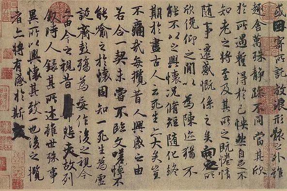况且这文章单拎出来也是名篇,前半部分讲风流之盛,后半部分感时伤怀,最后慨叹人生,“寄蜉蝣于天地,渺沧海之一粟。”加上高绝的书法技艺,完美!人家主业是写字,文章又写得震古铄今,怎么让人不嫉妒!