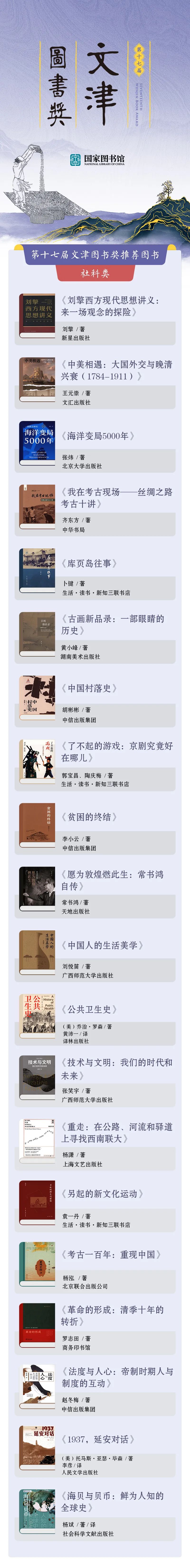 旨在为读者评选好书的文津图书奖创设至今,已经评出获奖图书192种、推荐图书748种。第十七届文津图书奖历时近五个月的推荐、讨论与评审,最终有19种获奖图书(社科类9种、科普类4种、少儿类6种)以及51种推荐图书(社科类20种、科普类11种、少儿类20种)从2000余种书中脱颖而出!