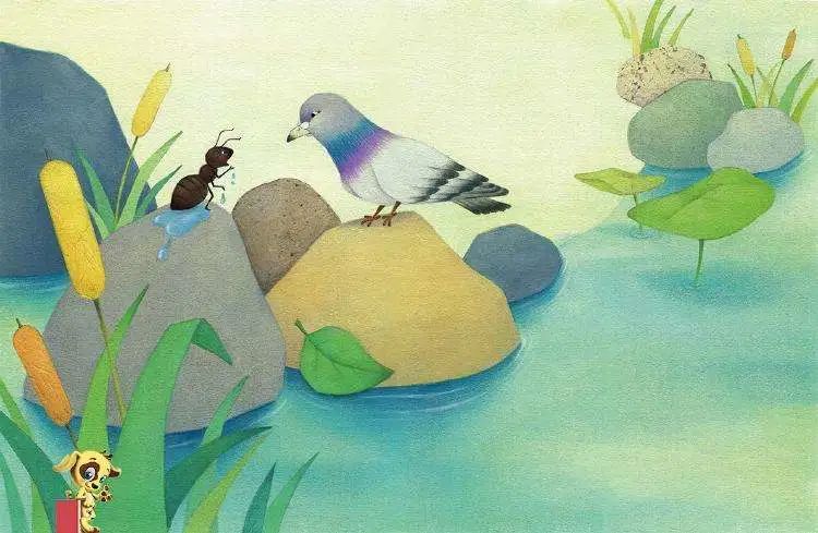 鸽子往下一看,原来是一只大蚂蚁掉到水里了。鸽子对大蚂蚁说:“大蚂蚁,别害怕,我来给你想办法!”