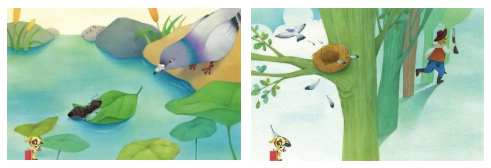 说着,鸽子叼了一片树叶子,低飞到水面,把树叶扔在大蚂蚁面前,又对蚂蚁说:“大蚂蚁,你用这片树叶当小船儿,风一吹就把你送上岸了。”