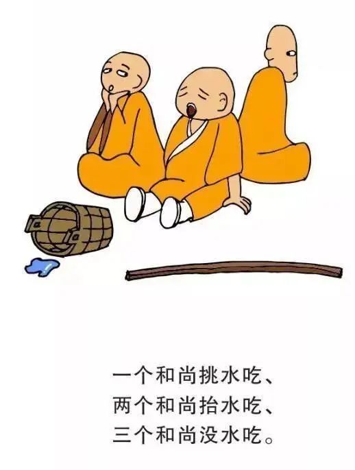 这个故事告诉我们,办一件事,如果没有制度作保证,责任不落实,人多反而做不成事。三个和尚为什么没水喝,因为三个和尚属于同一种心态,同一种思想境界,谁都不想多出一份力,都想依赖别人,在取水的问题上互相推诿,结果谁也不去取水,以致大家都没水喝。我们要明白团结力量大,互相推卸责任和义务是什么事情都做不成的哦!
