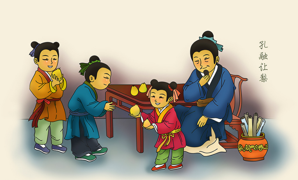 李贤注解的《后汉书·孔融传》中的《融家传》记载:”孔融四岁的时候,和哥哥们一起吃梨,孔融总是拿小的吃。有大人问他为什么这么做。他回答说:"我年龄小,食量小,按道理应该拿小的。“由于孔融这么聪明早慧,很小就懂得这样的道理,宗族亲戚们认为他是个奇才。”