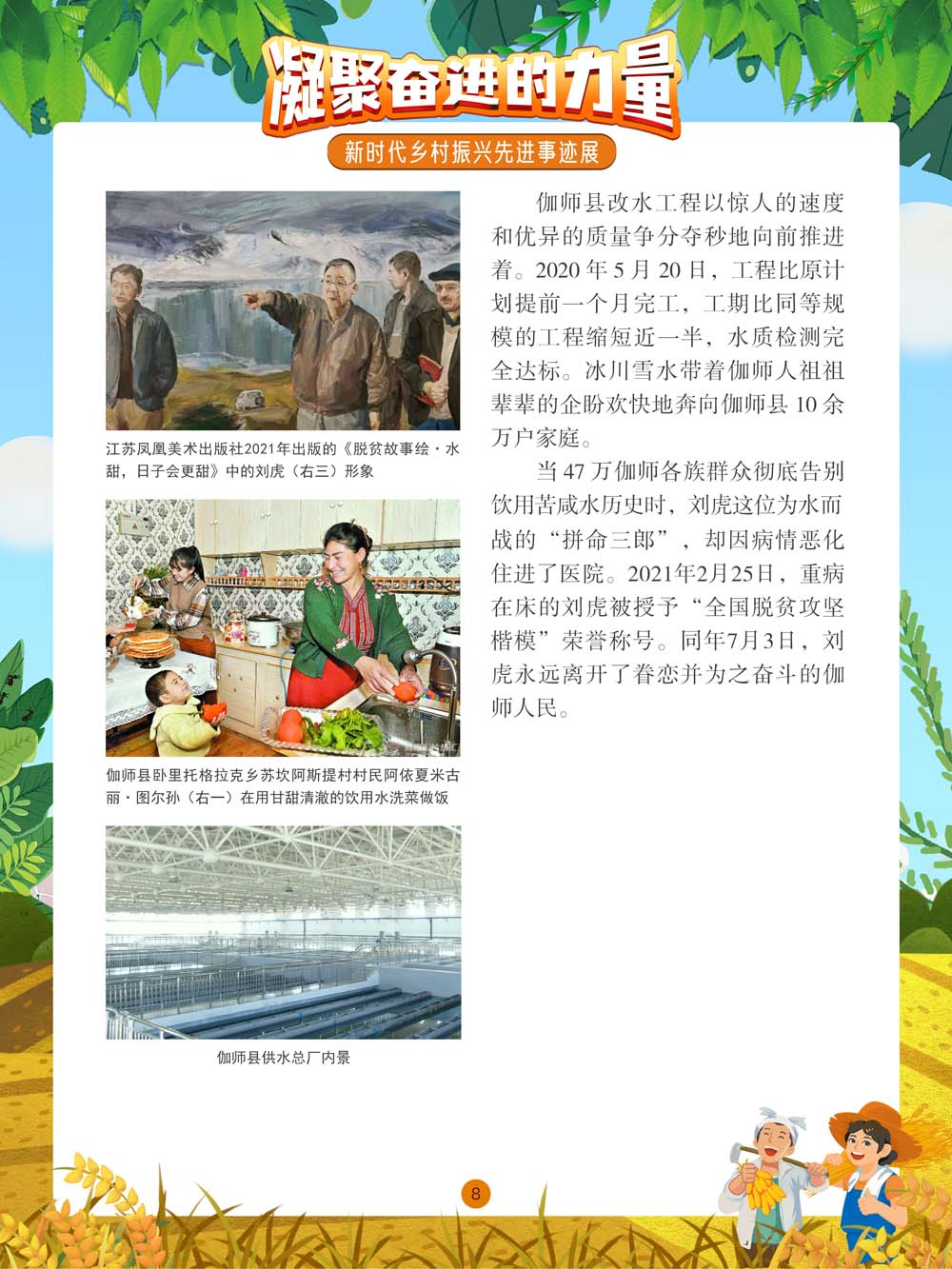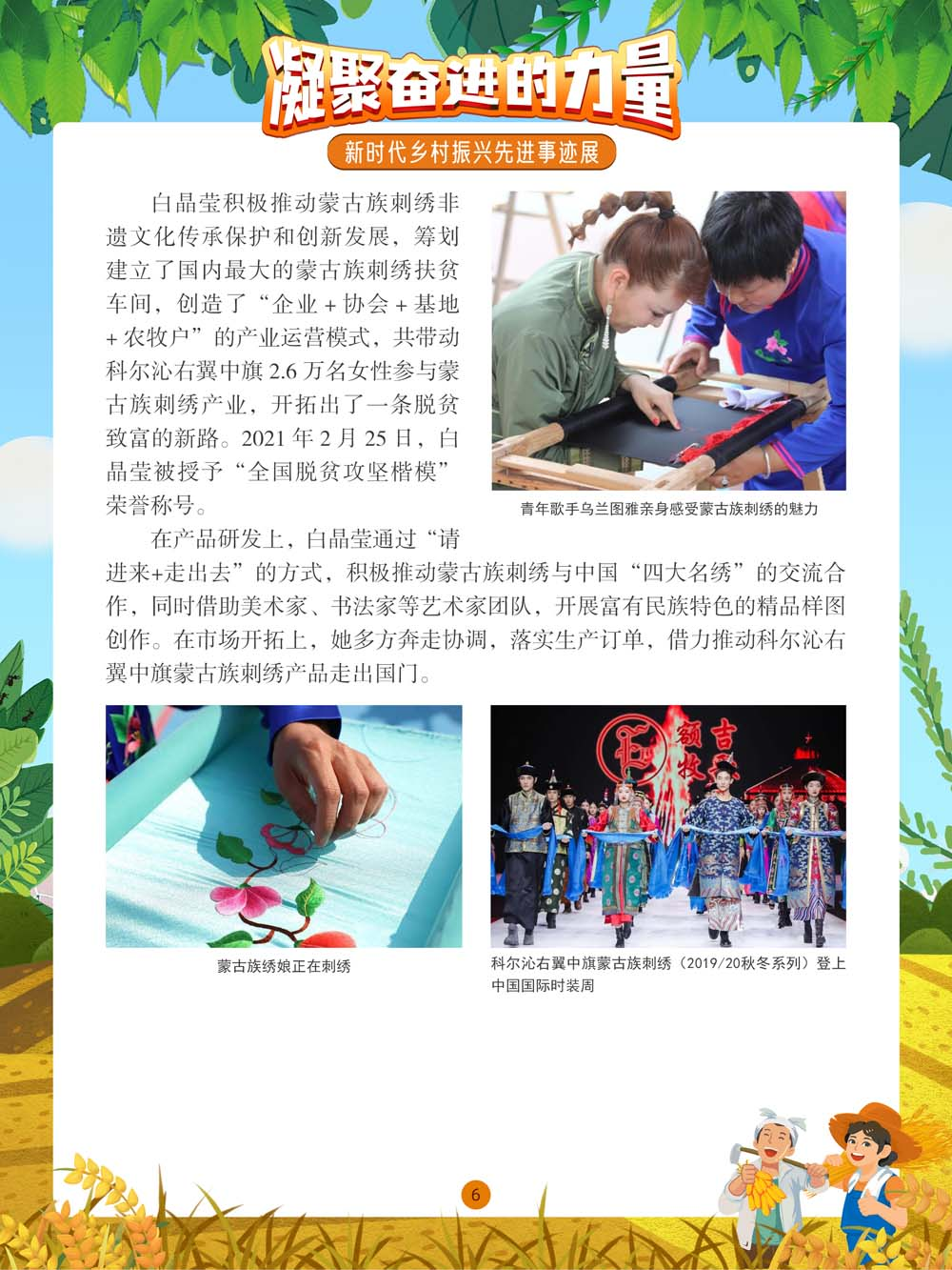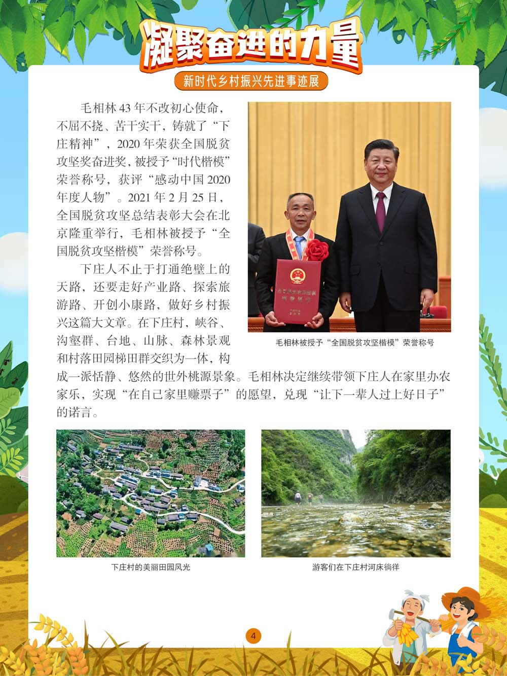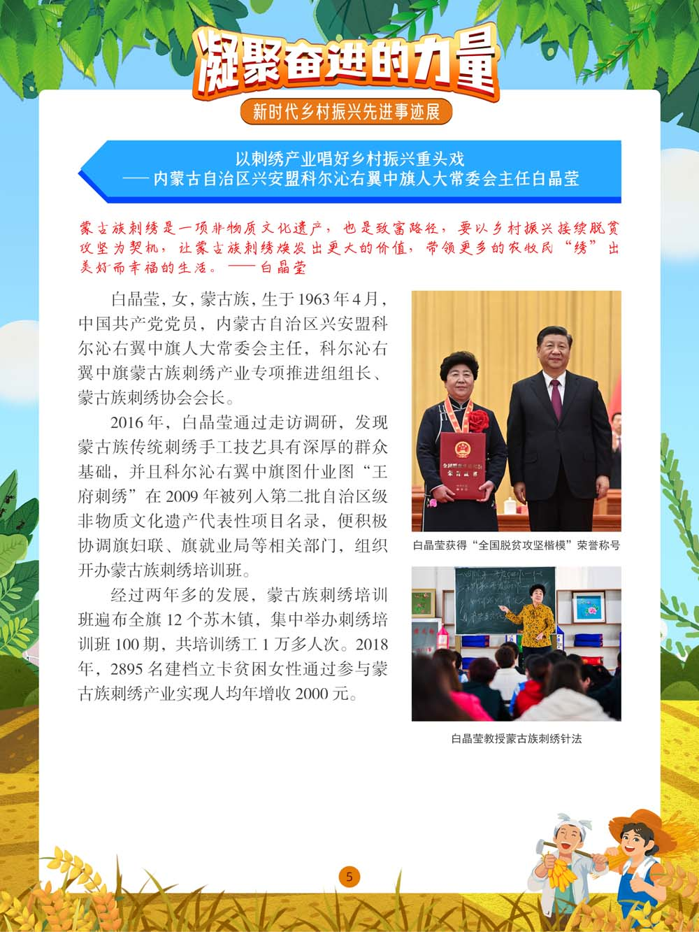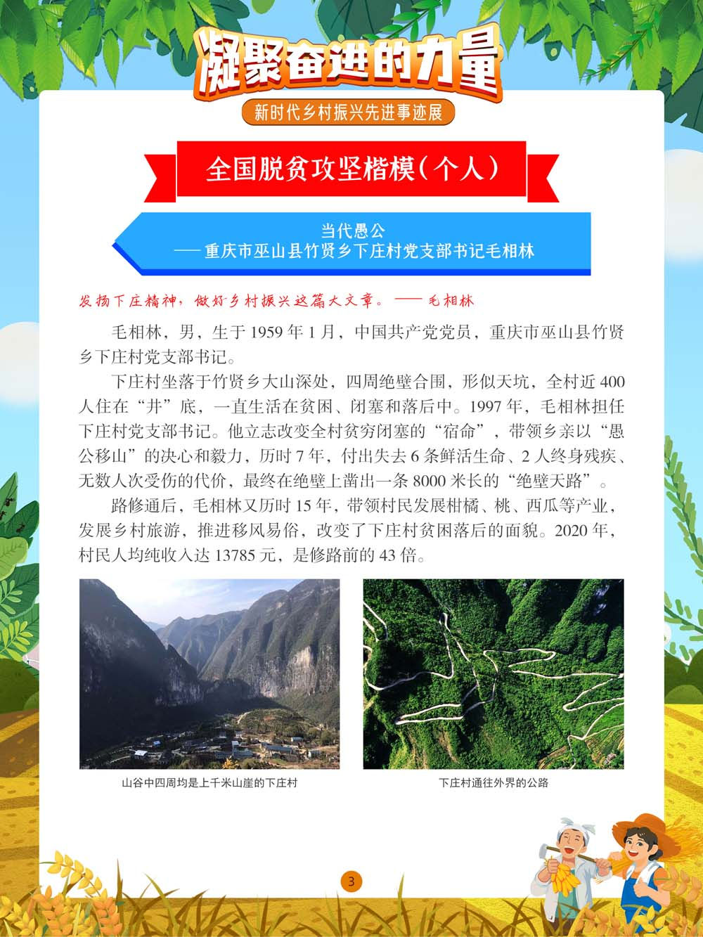 凝聚奋进的力量 新时代乡村振兴先进事迹展 展览●简介 奋斗是国家繁荣富强的源泉。我们的国家,我们的民族,从积贫积弱一步一步走到今天的发展繁荣,靠的就是一代又一代人的拼搏奋斗。习近平总书记强调:“社会主义是干出来的,新时代也是干出来的。”在以习近平同志为核心的党中央坚强领导下,全国各族人民团结一致,接续奋斗,新时代乡村振兴的大美画卷在中国大地上徐徐展开。 举世瞩目的巨大成就凝聚着中国人的聪明才智,浸透着中国人的辛勤汗水。本展览通过展示在中国乡村振兴过程中涌现出的众多带头苦干、聚力攻坚的典型人物、典型事迹,以及由此带来的乡村风貌的焕然一新,歌颂每一位为美好未来不懈奋斗的劳动者。 展览主办单位 广阳区公共图书馆 策展单位 神州共享(北京)文化传媒有限公司 展板●内容 图丨展览精彩呈现(部分) (进入全景展后,①点击图片可进入大图查看模式,支持图片放大和滑动切换图片。点击右下角小话筒按钮切换背景音乐/语音解说;②若全景角度改变,可点击右上角“复位”恢复视角。)