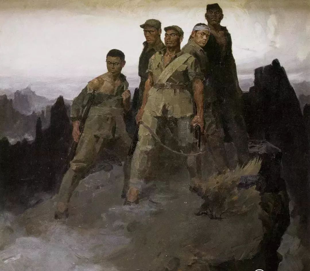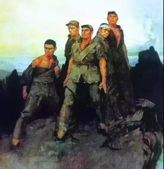 这幅附于课文之后《狼牙山五壮士》插画虽然画质不一定清晰,但是画中纪念碑式的坚毅悲壮成为5位英雄在人们心中的最终定格。它由28岁的油画家詹建俊画于1959年。当时他接到的任务是为刚刚成立的中国革命军事博物馆创作一批军事历史题材的美术作品。在众多创作主题中,詹建俊选择了“狼牙山五壮士”。
