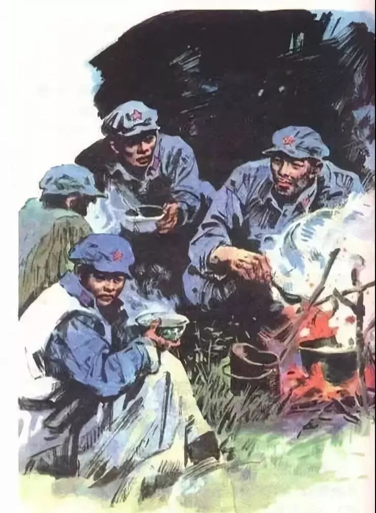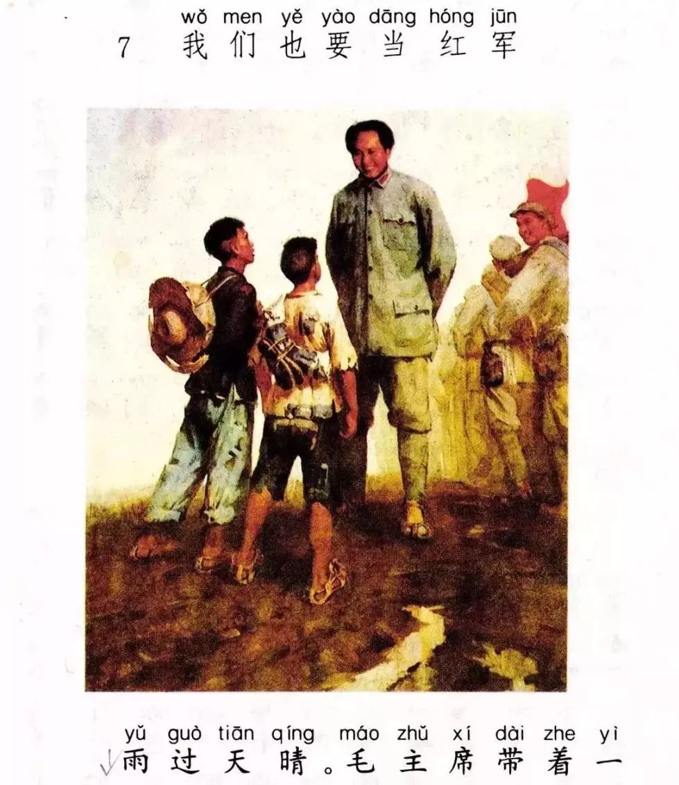 这是课文《我们也要当红军》的插画,描写的是在荒野茫茫的崎岖山路上,两个历尽辛苦、长途跋涉的贫苦少年,终于赶上红军队伍并要求参军,而毛主席微笑着答应他们参军的场景。