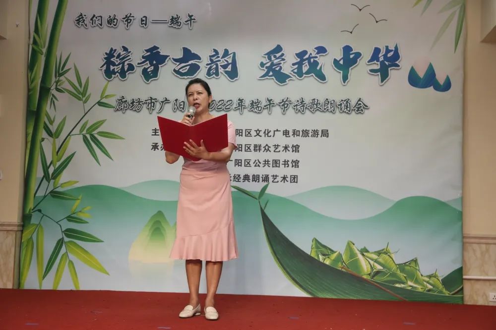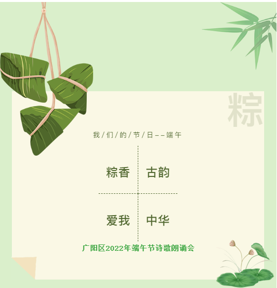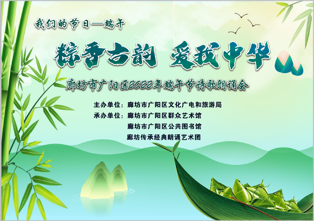 为了弘扬传统文化与社会主义核心价值观,营造浓郁的节日氛围,廊坊市广阳区文化广电和旅游局将一场“‘粽香古韵 爱我中华’2022年端午节诗歌朗诵会”,以线上方式献给勇立时代大潮中的每一位观众,用诗和远方、用我们的激情和热爱、用我们不屈不挠的意志塑造端午。