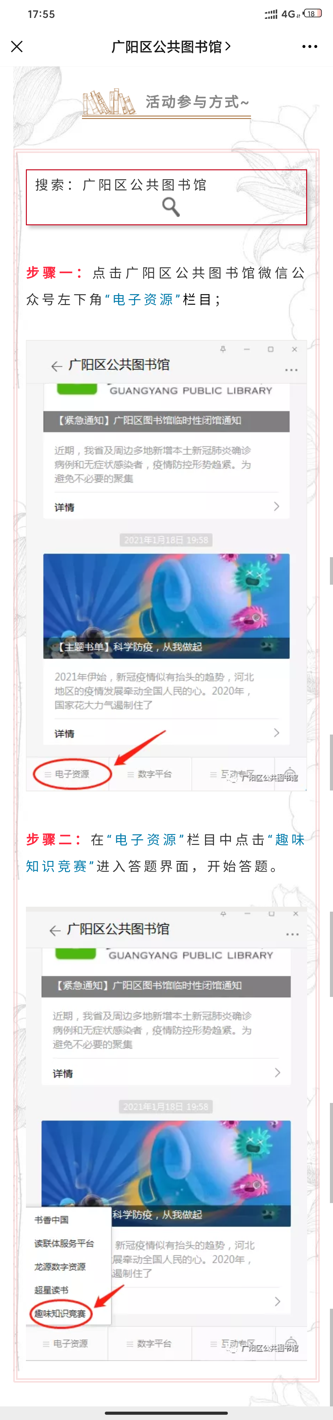 2021年“两节”期间,廊坊市广阳区文化广电和旅游局在严格执行疫情防控工作要求的前提下,努力营造节日喜庆氛围,由广阳区图书馆和广阳区群艺馆共同推出线上系列文化活动,闭馆不闭网,快乐不打烊!