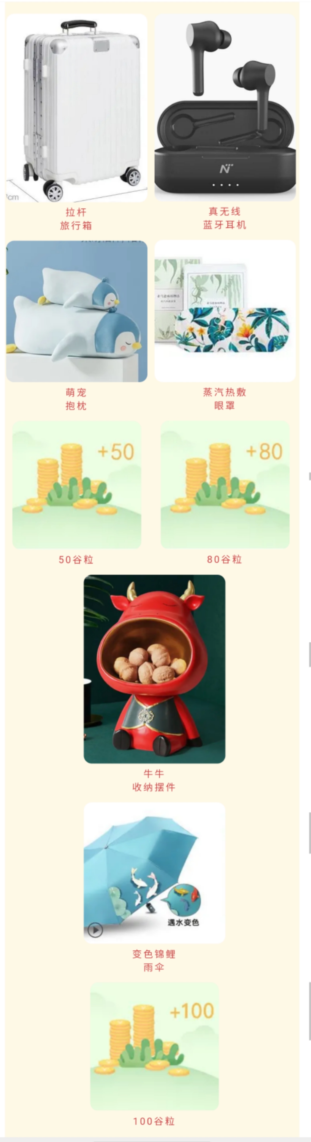 带你去旅行——拉杆行李箱、陪你听遍世间好声音——真无线蓝牙耳机、牛气冲天——牛牛收纳摆件、巨萌无比——萌宠抱枕、关爱你的双眼——蒸汽热敷眼罩、新年就要做锦鲤——变色锦鲤雨伞,以及积攒够了就可以去优谷谷粒商城兑换礼品的谷粒。