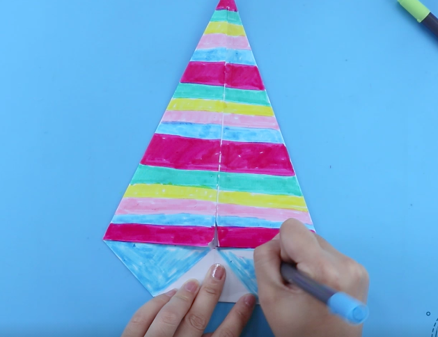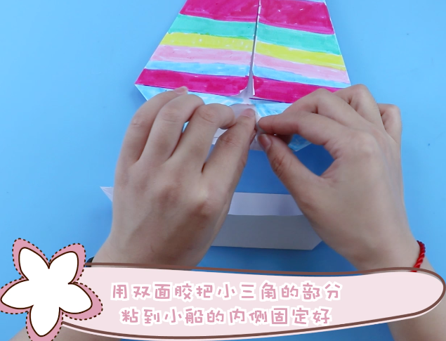 3将白纸涂成自己喜欢的颜色,并用双面胶把小三角的部分粘到小船内侧固定好;