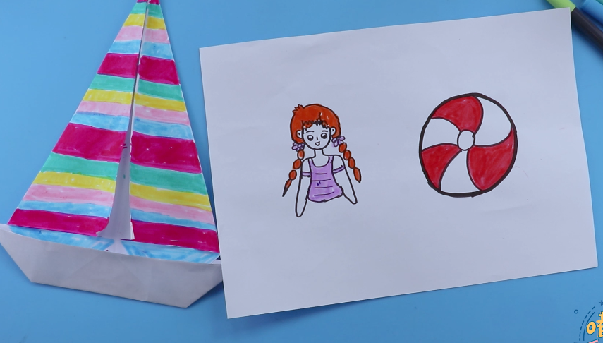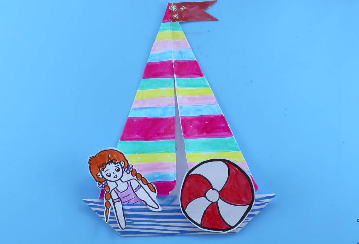 4用剪刀把画好的图案剪下来,将小朋友固定在船体内侧,把救生圈粘到船体上,剪一面旗子粘上去,涂上颜色;