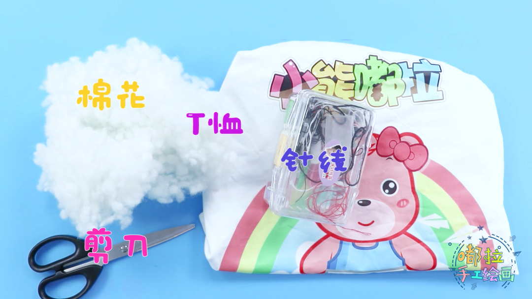 我们的手工课程需要准备以下材料:旧T恤、剪刀、针线、棉花、笔。