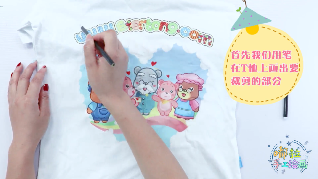 用笔在T恤上画出要裁剪的地方