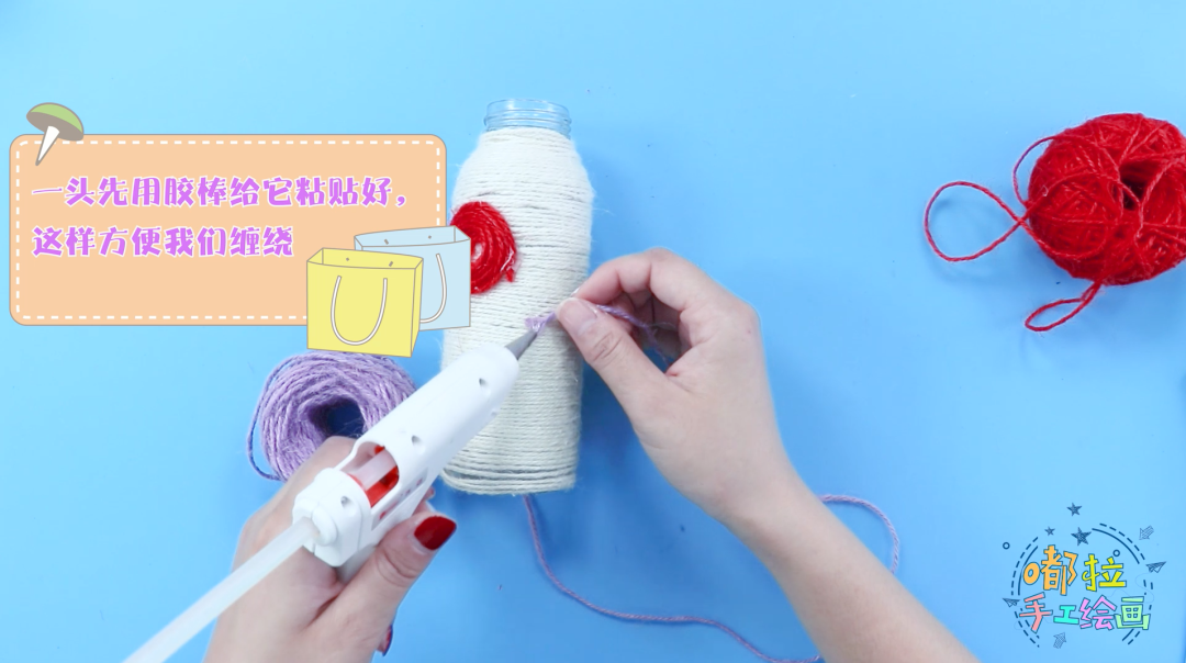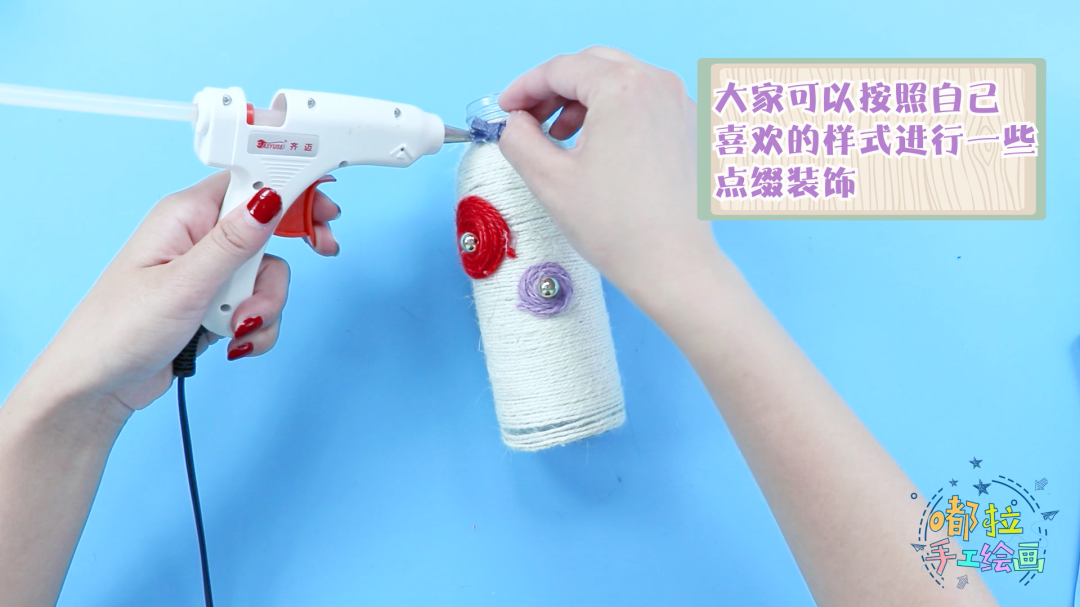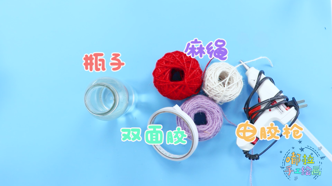 本次课程用到的材料有:瓶子、麻绳、电胶枪、双面胶、以及一些小装饰品。