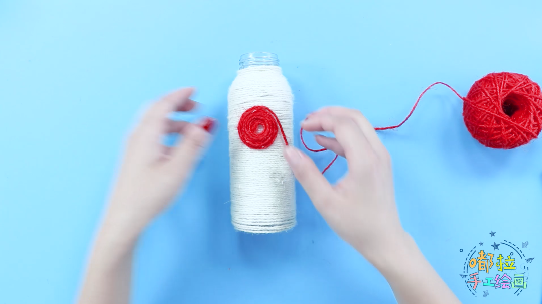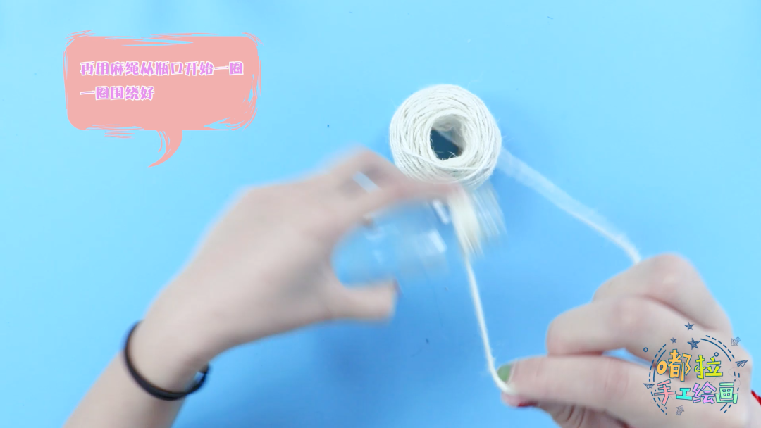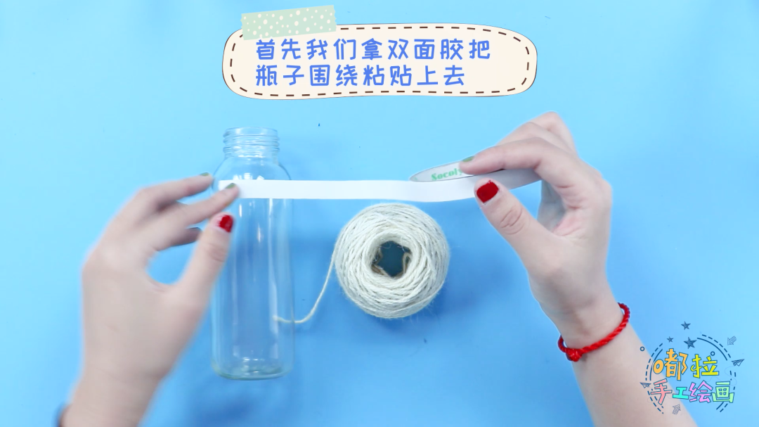 首先我们在塑料瓶子外缠上一圈双面胶,然后用白色棉线包住。