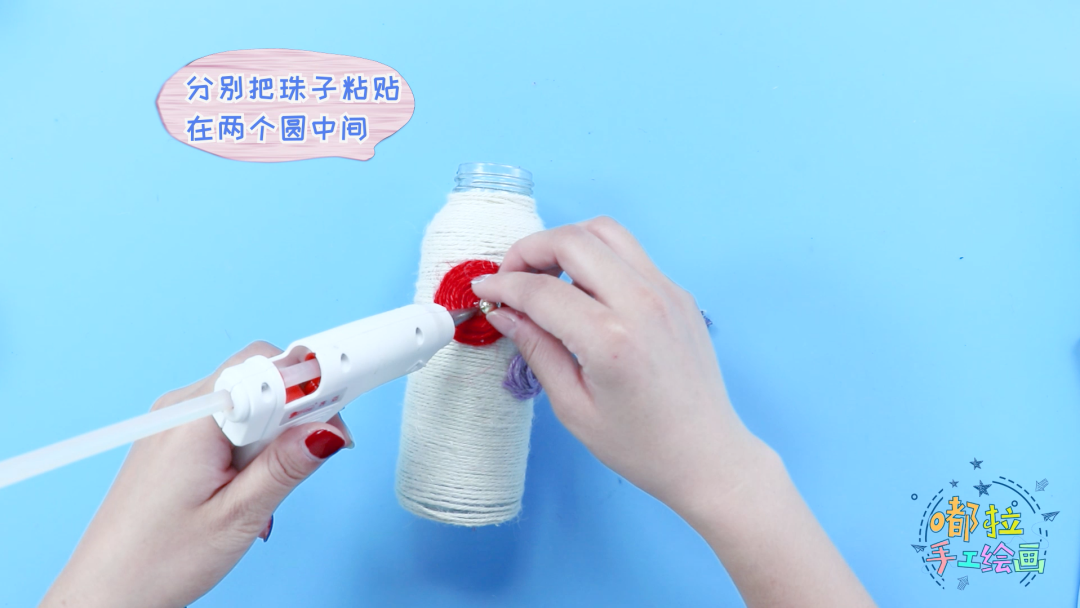 然后将其他颜色的棉线绕成大小不一的圆圈后用电胶枪固定作为装饰。
