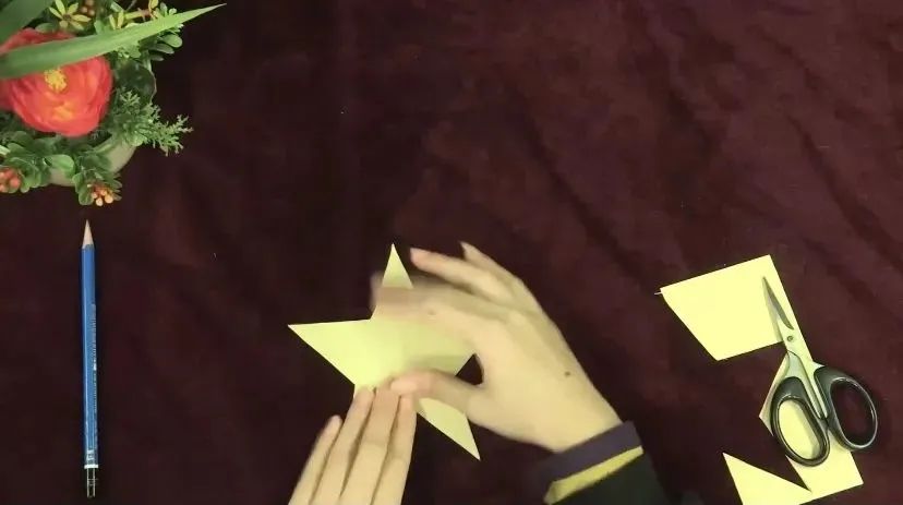 剪纸—“星星”"一闪一闪亮晶晶,满天都是小星星" 这首儿歌一直陪伴着我们成长,那小朋友们是不是曾幻想可以摘一颗天上的星星呢?今天我们就来学习一下,如何用剪纸的方法剪出一颗小星星,只需简单几个步骤,你也可以拥有一颗星星哦!材料准备操作步骤1、准备一张正方形的彩色卡纸。2、将卡纸像图片里一样对折。3、用铅笔在纸上画出三个角。4、用剪刀沿着刚才画的星星轮廓进行裁剪。5、剪好后慢慢打开。6、剪纸五角星就完成啦!