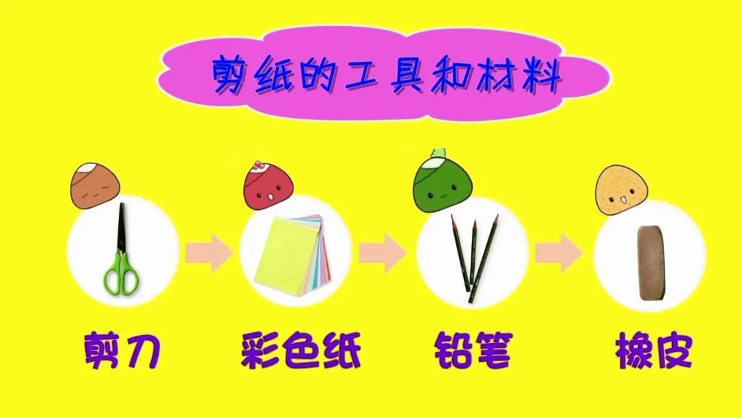 今天的课程需要的材料有:剪刀、彩色纸、铅笔和橡皮,使用剪刀的时候一定要注意安全。