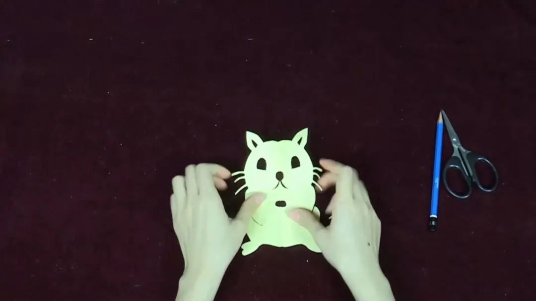 4.裁剪结束后,将彩色纸慢慢的打开就可以得到一只超可爱的剪纸猫啦!