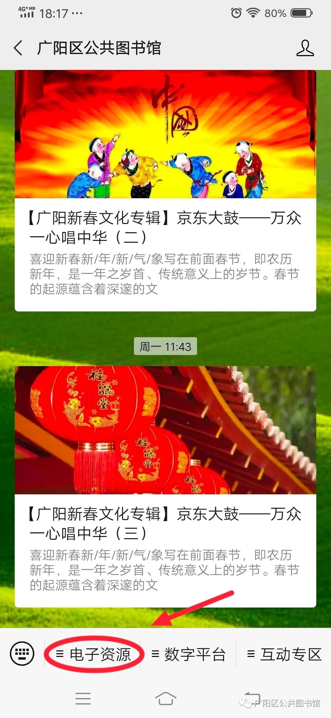 步骤一:点击广阳区公共图书馆微信公众号左下角“电子资源”栏目;