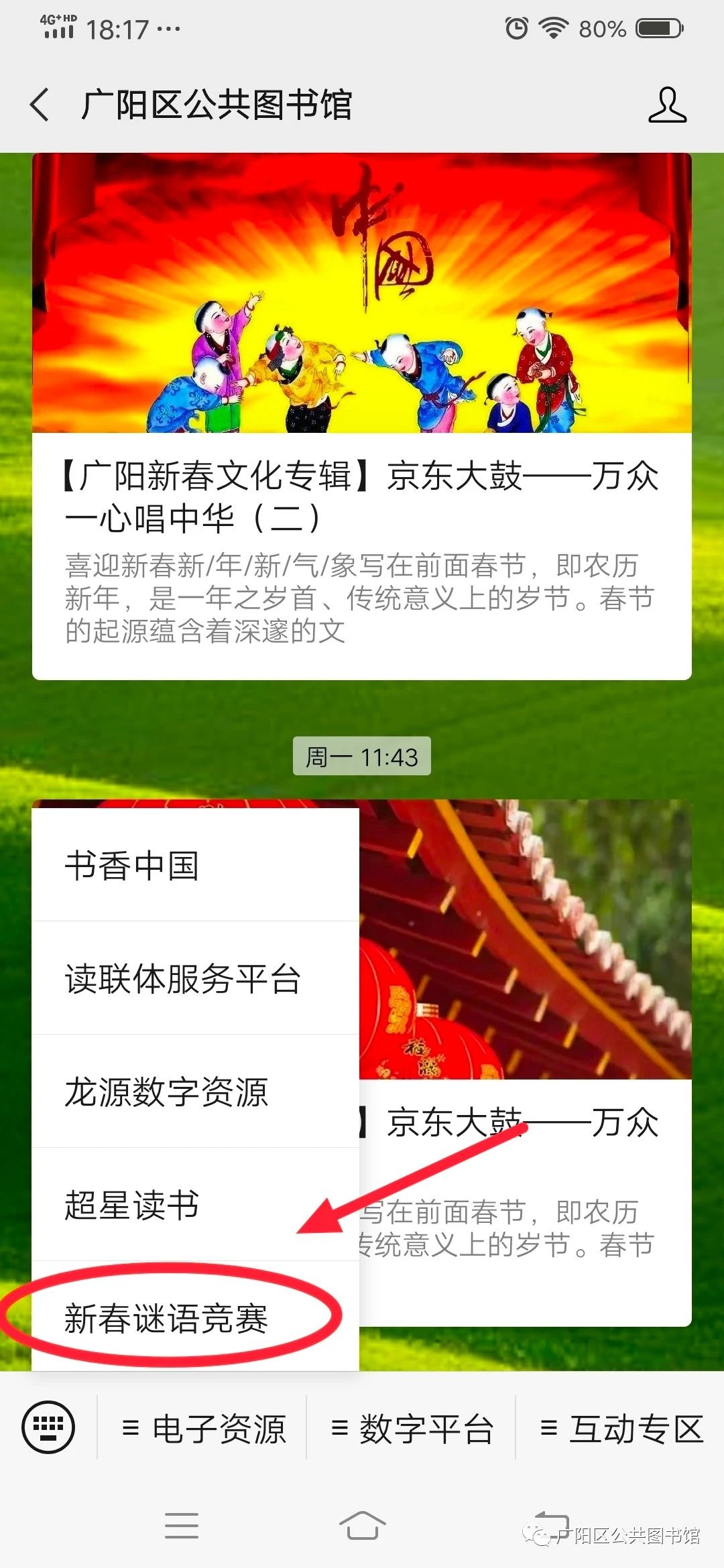 步骤二:在“电子资源”栏目中点击“新春谜语竞赛”进入答题界面,开始答题。