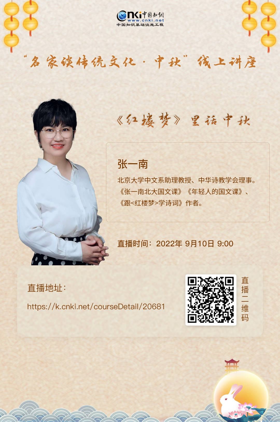 中秋节作为中国四大传统节日之一,深受人们的喜爱。在中秋节到来之际,我们将邀请北大中文系助理教授张一南为大家以《红楼梦》里话中秋为题讲解名著中的中秋故事,与大家一同阅读经典,品味文化,欢度中秋。本活动将于9月10日9:00上线,敬请关注。
