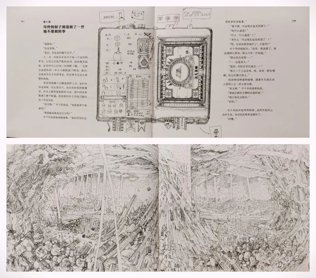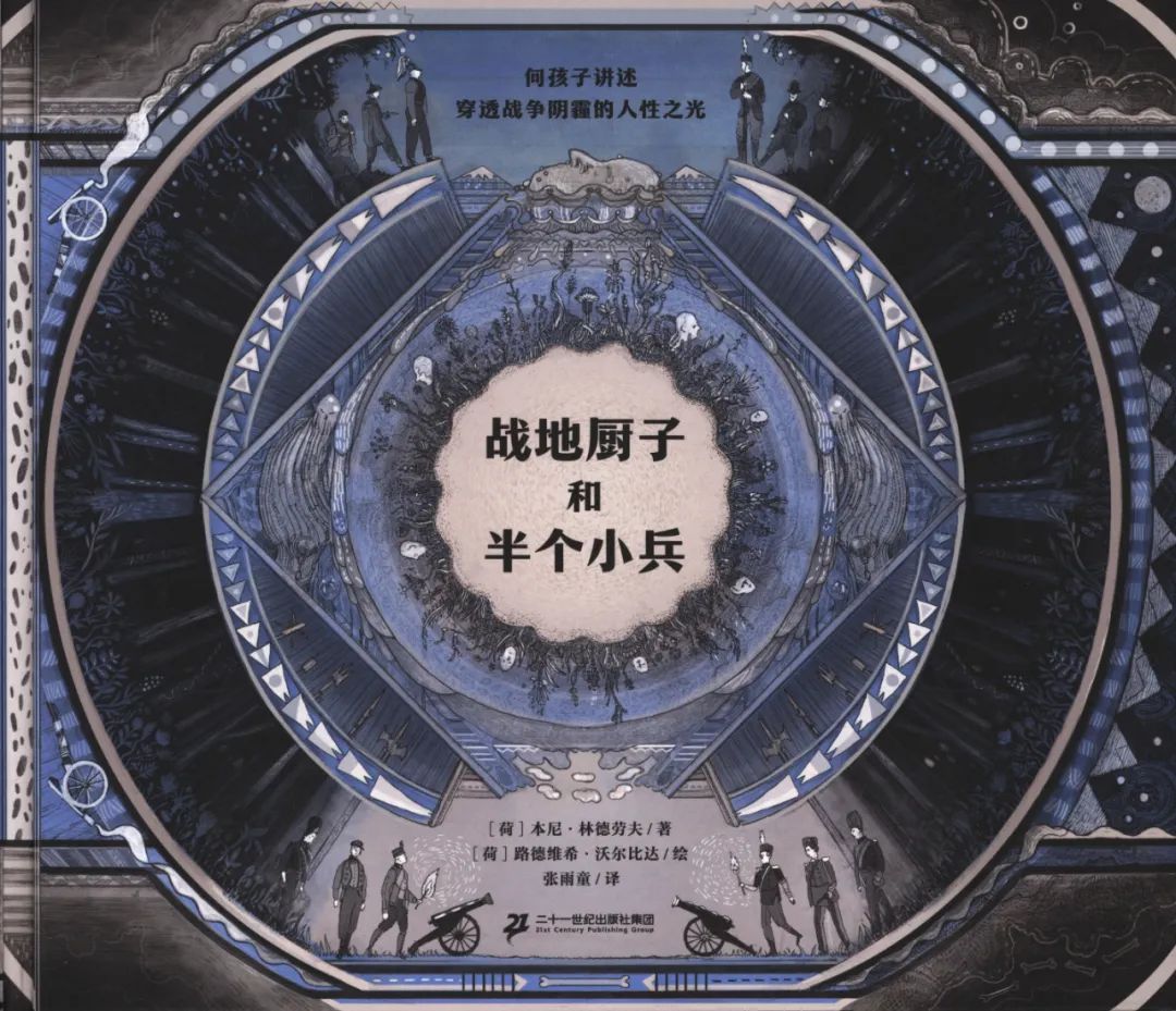 插图是这本书氛围塑造的重要辅助。沃尔比达运用充满装饰性的细腻线条,加入大量的象征手法,引导读者思索文字背后更庞大的历史背景与幽深隐喻。画中枪炮扭曲在一起,贯通天地,士兵仿佛戴着奇怪的面具,面目模糊。巨大的统治者的脑子里只有手枪、硝烟和军队,乡间的孩子们玩着战争游戏,丝毫没有意识到这代表了什么。画面不仅呈现了文字的内容,也忠实传达出了文本下更深的内涵。
