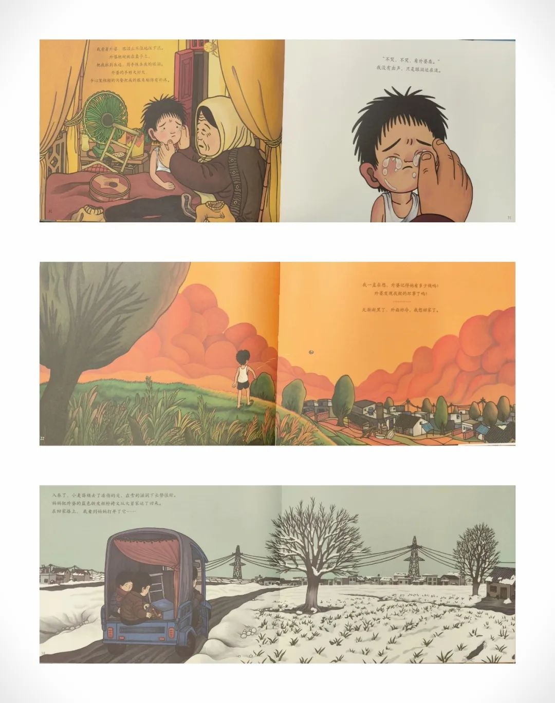 本书通过大量全景构图,在广袤的北方农村平原上铺陈出故事发生的背景。同时,详细地描绘出幼年生活中的场景、人物和物件。这种精确的图像叙述体现出作者想要确认记忆的努力,为简约的文字提供了更多内容的延展。人物形象的塑造平实且不夸张,将故事的情绪开展交付于一个又一个充满“气氛”的场景。比如,在小孩与外婆相处的场景中,绘者用柔和的暖色调来烘托灯光下的情感交流,给人一种温馨的氛围感……这本图画书的主角看似是孩子,其实也是“回忆”,无论是文字还是图像,都将重点放在了“成长、回忆和思念到底是什么”这个主题上。
