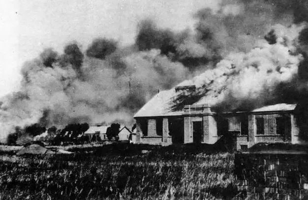 遭日军袭击后起火的红顶山中国军营