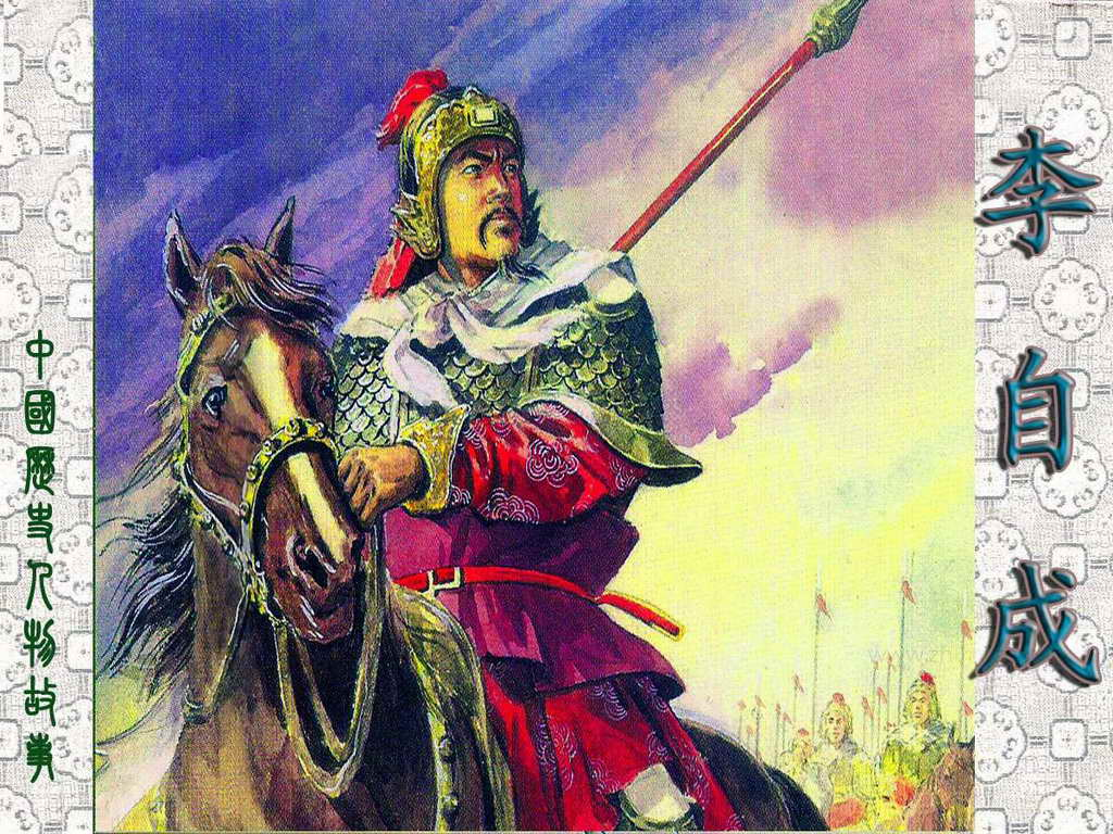 李自成(1606—1645),原名鸿基,明末农民起义领袖之一,陕西米脂人。崇祯二年(1629)起义,后为闯王高迎祥部下闯将,高迎祥死后,继号闯王,勇猛而有识略。他提出“均田免赋”等口号,获得广大人民的欢迎,时有“迎闯王,不纳粮”的歌谣。崇祯十七年(1644)正月,建立大顺政权,年号永昌。不久,攻克北京,推翻了明王朝。后来,清军入关,李自成兵败南下,于顺治二年(1645)在湖北通城九宫山被地主武装杀害。所部继续坚持抗清。