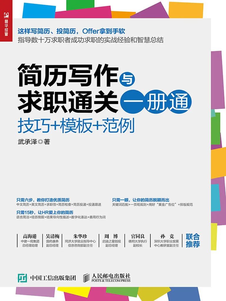 内容简介:本书涵盖了中文简历、英文简历、求职信、简历投递、求职跟进和企业调查等多个方面,也在一些章节提及了与简历内容相关的笔试和面试中需要注意的事项。本书不仅适用于计划寻找工作的广大求职者(含在校生、已经有工作经验的社会人士、科研院所求职),对于升学、出国留学的同学也有很好的参考意义,也适合职业发展教育的从业者作为教学参考用书使用。