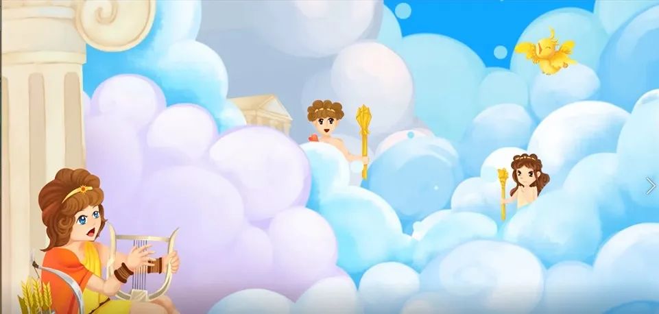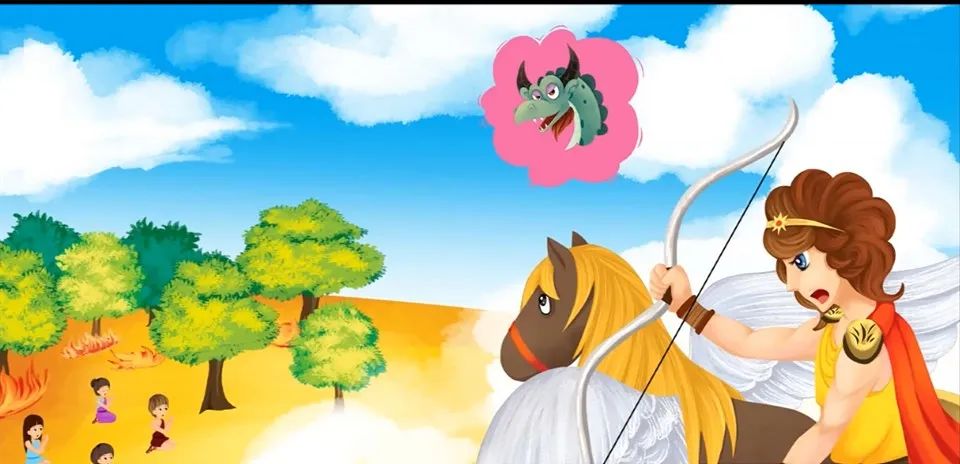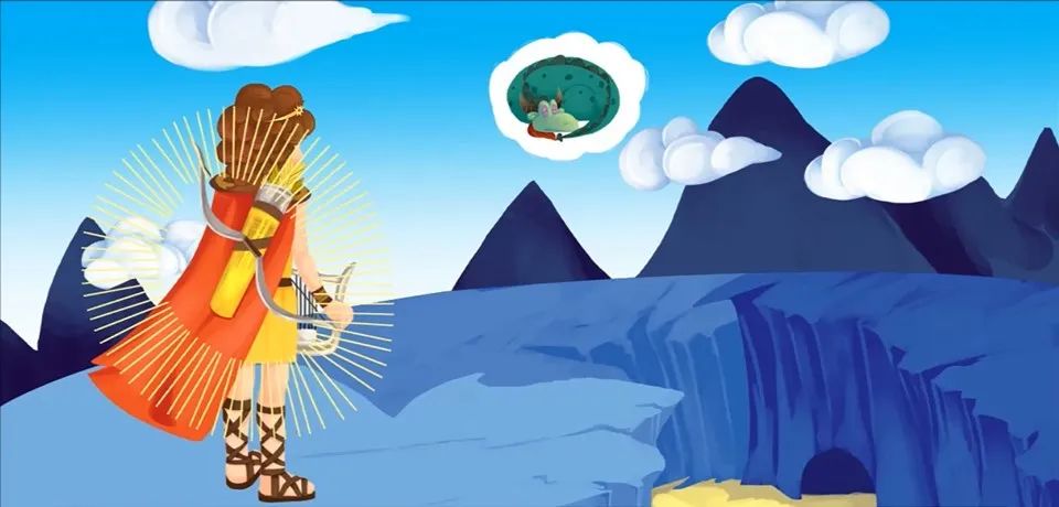 年轻的阿波罗手持竖琴,肩挎银弓在蔚蓝的天空中飞跑,金箭在箭袋里叮当作响。他奔向巨龙居住的洞穴,为失去家园的人们报仇。