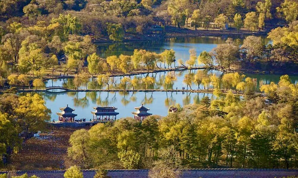 避暑山庄以朴素淡雅的山村野趣为格调,取自然山水之本色,吸收江南塞北之风光,整个山庄东南多水,西北多山,是中国自然地貌的缩影,也是中国园林史上一个辉煌的里程碑。