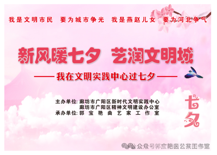 8月29日,广阳区“新风暖七夕·艺润文明城——我在文明实践中心过‘七夕’”文艺演出在广阳区公共图书馆“郭宝艳曲艺家工作室”成功举办。活动主办单位:廊坊市广阳区新时代文明实践中心、廊坊市广阳区精神文明建设办公室;承办单位:郭宝艳曲艺家工作室。