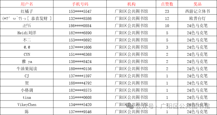 由广阳区文广旅局、广阳区公共图书馆及所属分馆主办的“青春无定义·读书正当时”开学季线上书评有好礼活动在读者们的积极参与下圆满结束啦!以下将公布本次活动的获奖读者名单,请中奖读者在领奖期间内凭中奖信息及时到馆领取奖品!