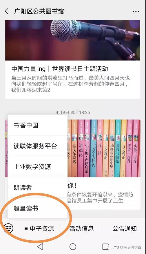 进入广阳区公共图书馆微信公众号,点击右下角“电子资源”,