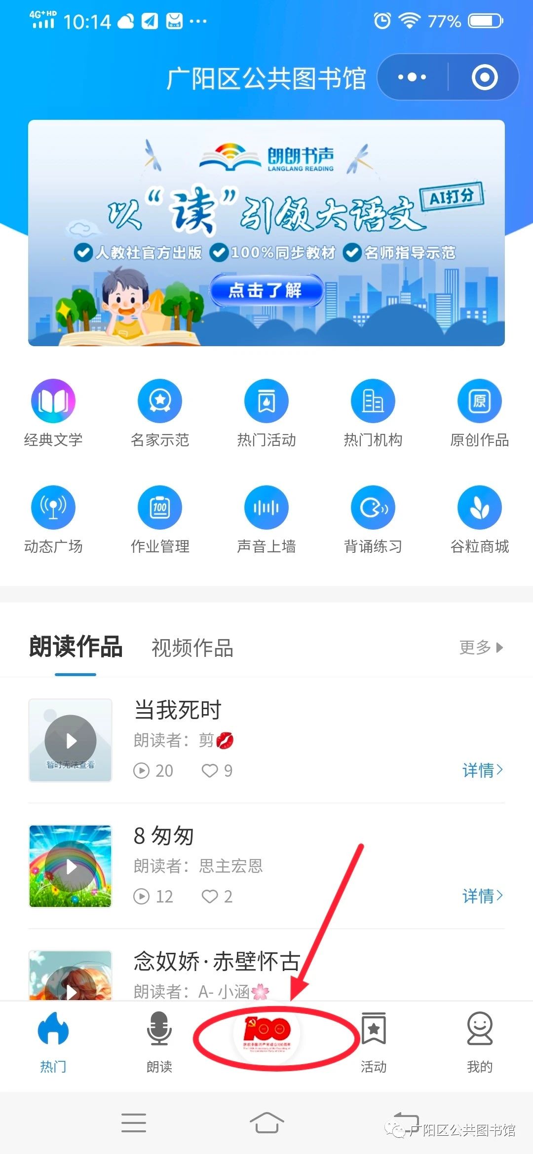 【朗读亭录制】登录身边的优谷朗读亭,点击屏幕上的活动轮播图进入本次活动。