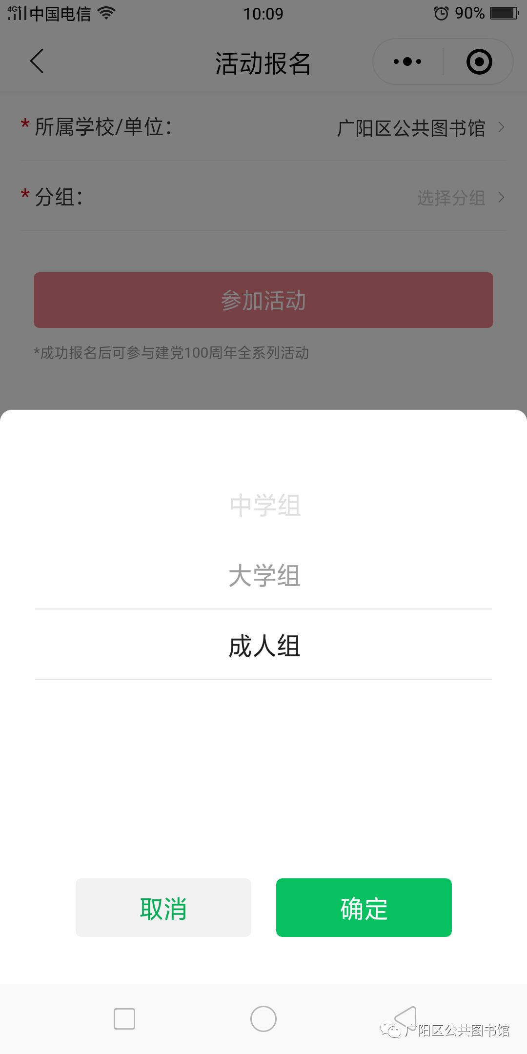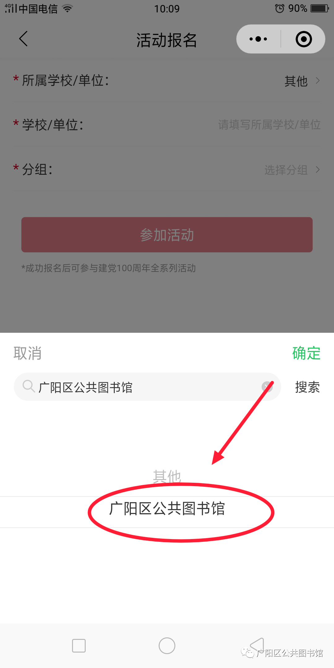 【云平台录制】参与者进入“广阳区公共图书馆”微信公众号,依次点击“电子资源”、“朗读云平台”,在打开的页面最下方中间位置,点击红色“100”字样,进入本次活动页面。如果您是初次使用,请按照系统提示进行登录;接下来点击“报名参与活动”,在“所属学校/单位”搜索“广阳区公共图书馆”选择并点击确定;在“分组”按照报名者的实际身份进行选择并确定;再依次填写姓名和年龄,点击提交。系统显示“已报名”,完成报名,即可开始参与活动。