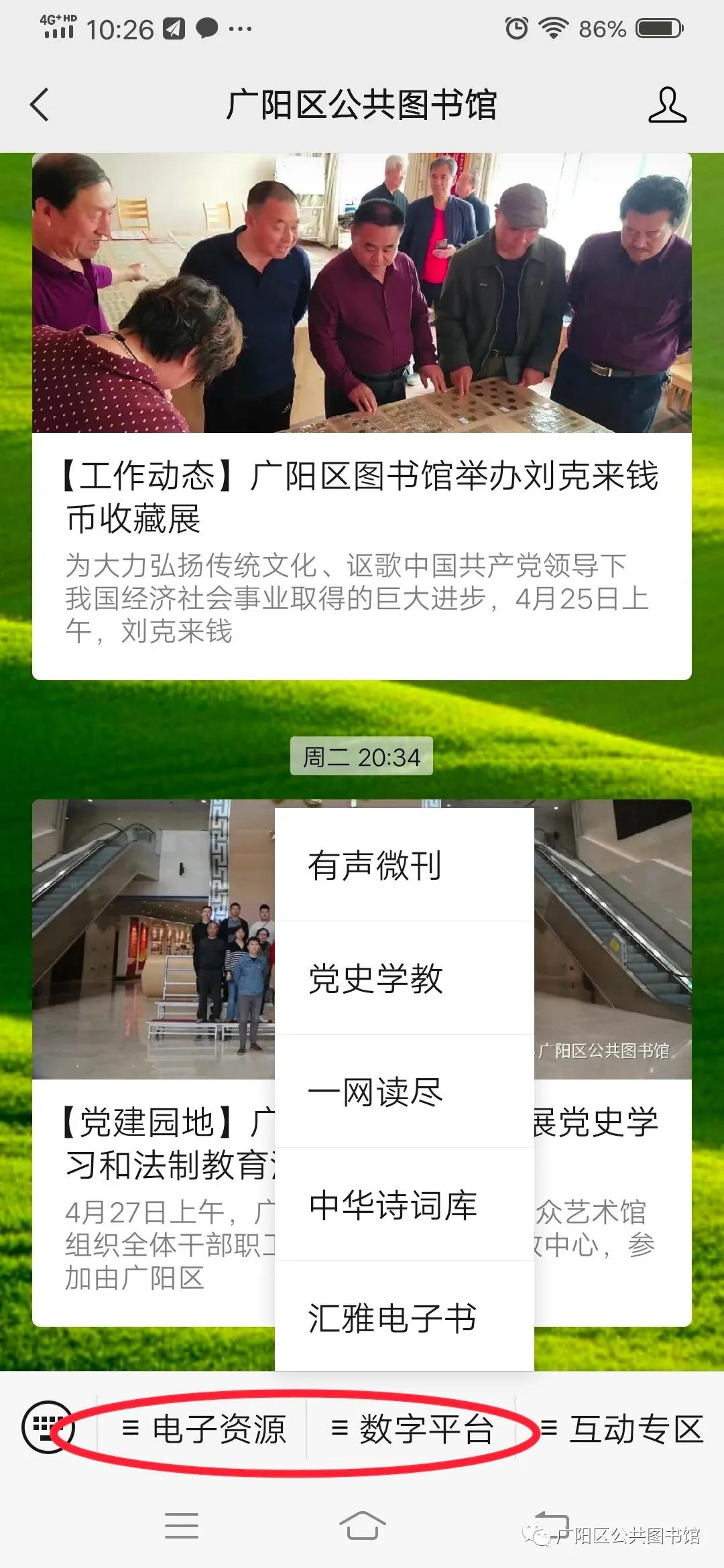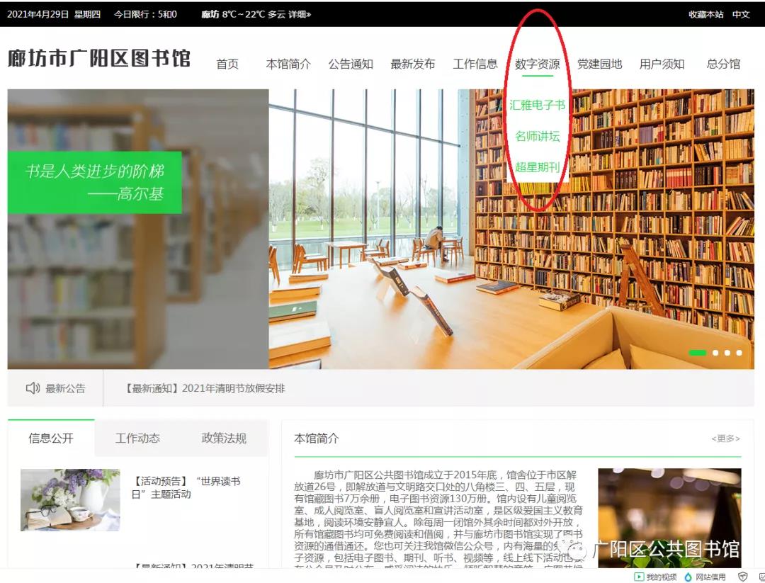 廊坊市广阳区公共图书馆2021年“五一”劳动节假期自2021年5月1日(周六)至5月5日(周三),5月6日(周四)起正常开馆。放假期间,您可通过关注我馆微信公众号,点击“电子资源”和“数字平台”,阅读浏览免费数字图书。或者登录广阳区图书馆网站 http://gytsg.org.cn ,点击“数字资源”您将能得到更多的视听享受(其中的“汇雅电子书”包含一百余万册电子图书资源)。上述电子资源具体获取方式如下: