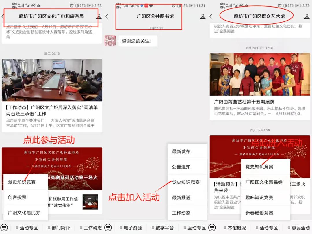 参与方式:登录廊坊市广阳区文化广电和旅游局、广阳区公共图书馆、廊坊市广阳区群众艺术馆微信公众号(图一),点击下方菜单栏的"党史知识竞赛”参与活动,具体操作步骤可观看下方图片哦!