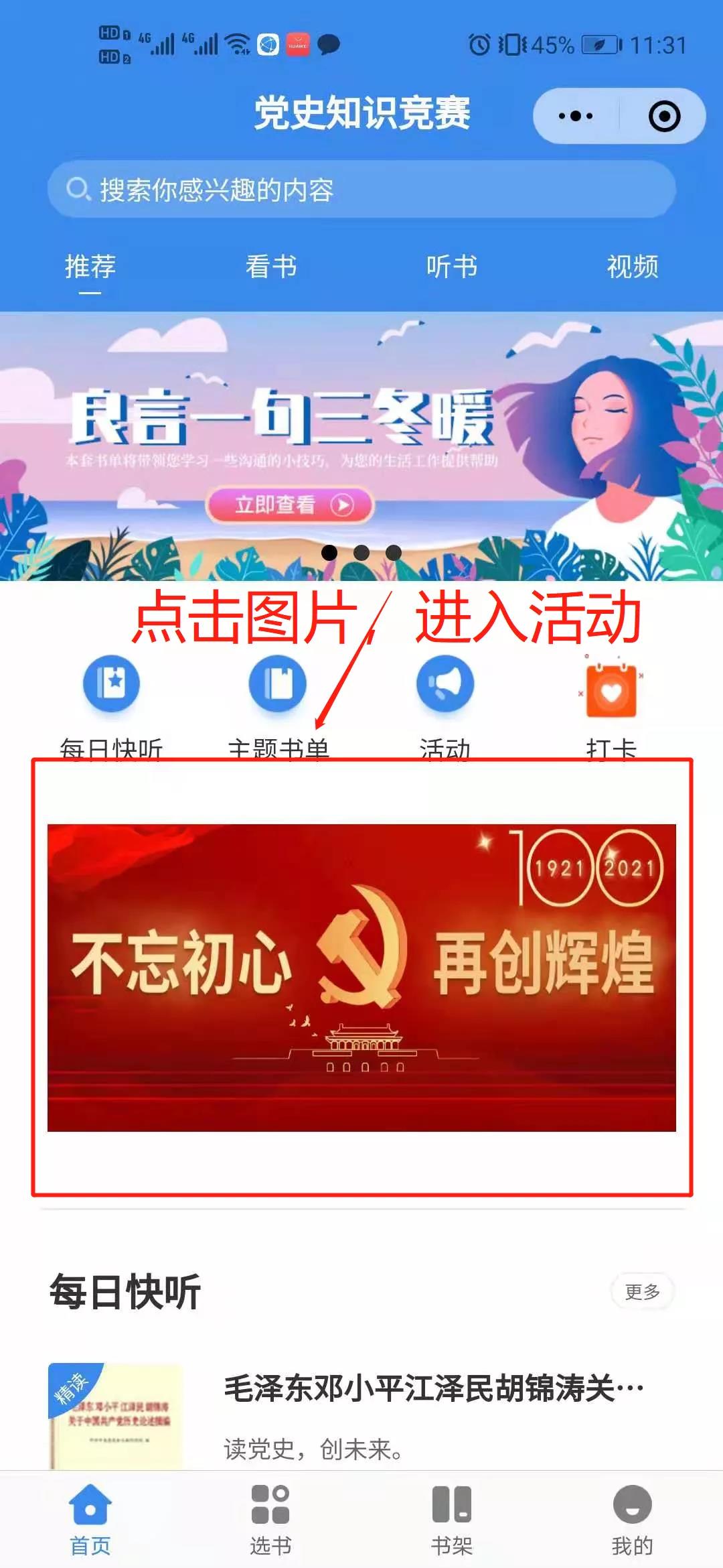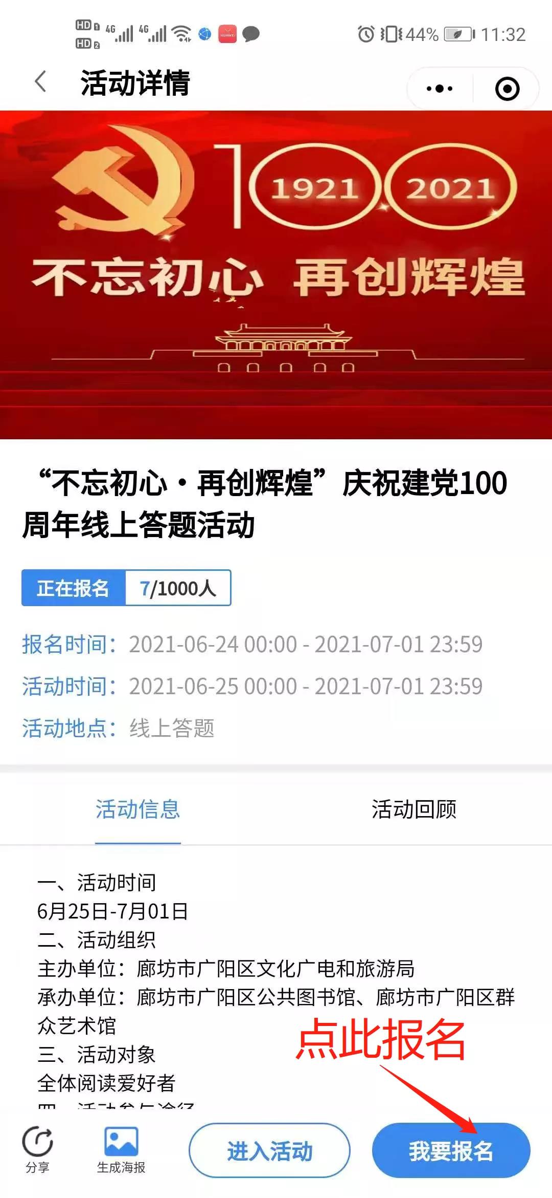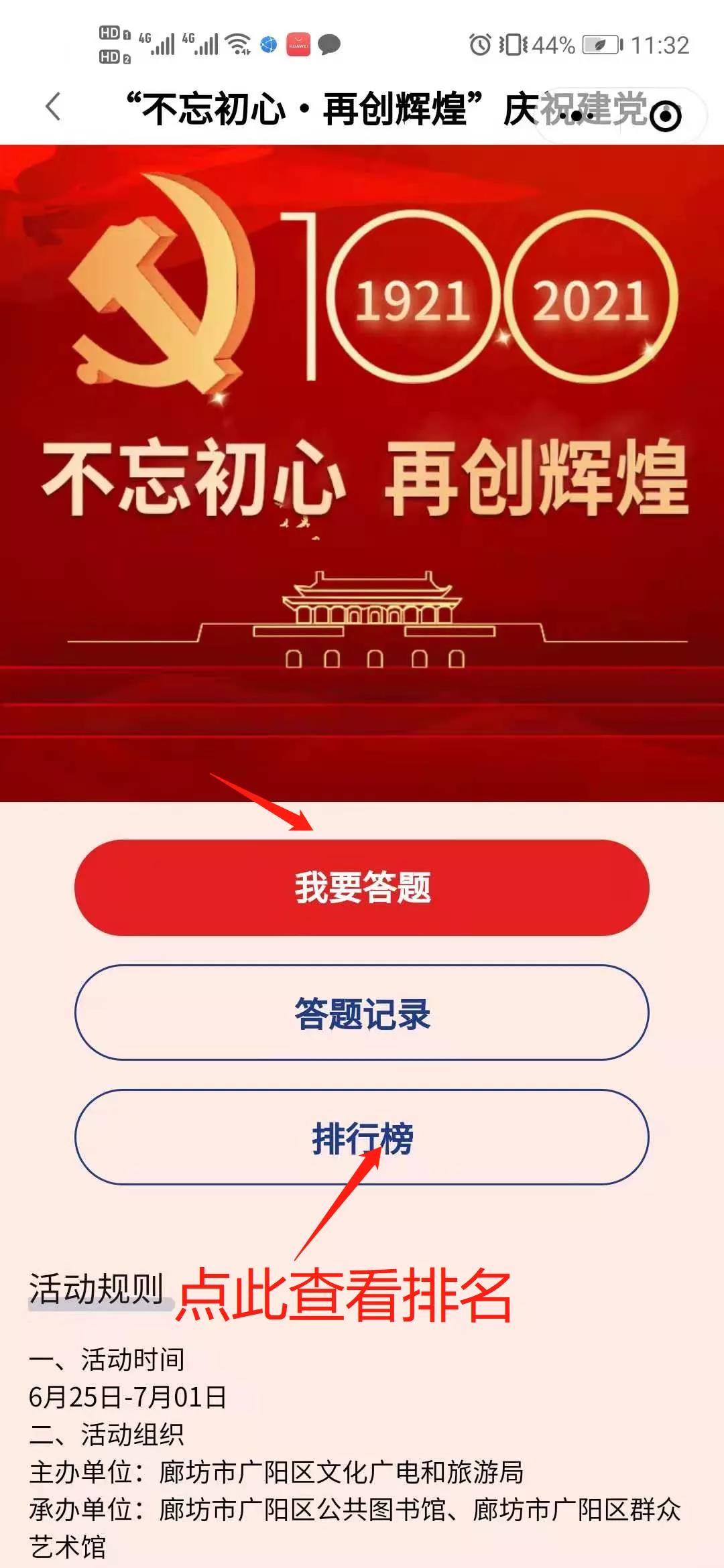 为庆祝中国共产党成立100周年,引导广大人民群众积极投入到党史学教活动中来,宣扬红色文化历史,推进“全民阅读”浪潮,经研究决定,由廊坊市广阳区文化广电和旅游局主办,廊坊市广阳区公共图书馆和廊坊市广阳区群众艺术馆共同承办,开展“不忘初心,再创辉煌”党史知识竞赛线上系列答题活动。
