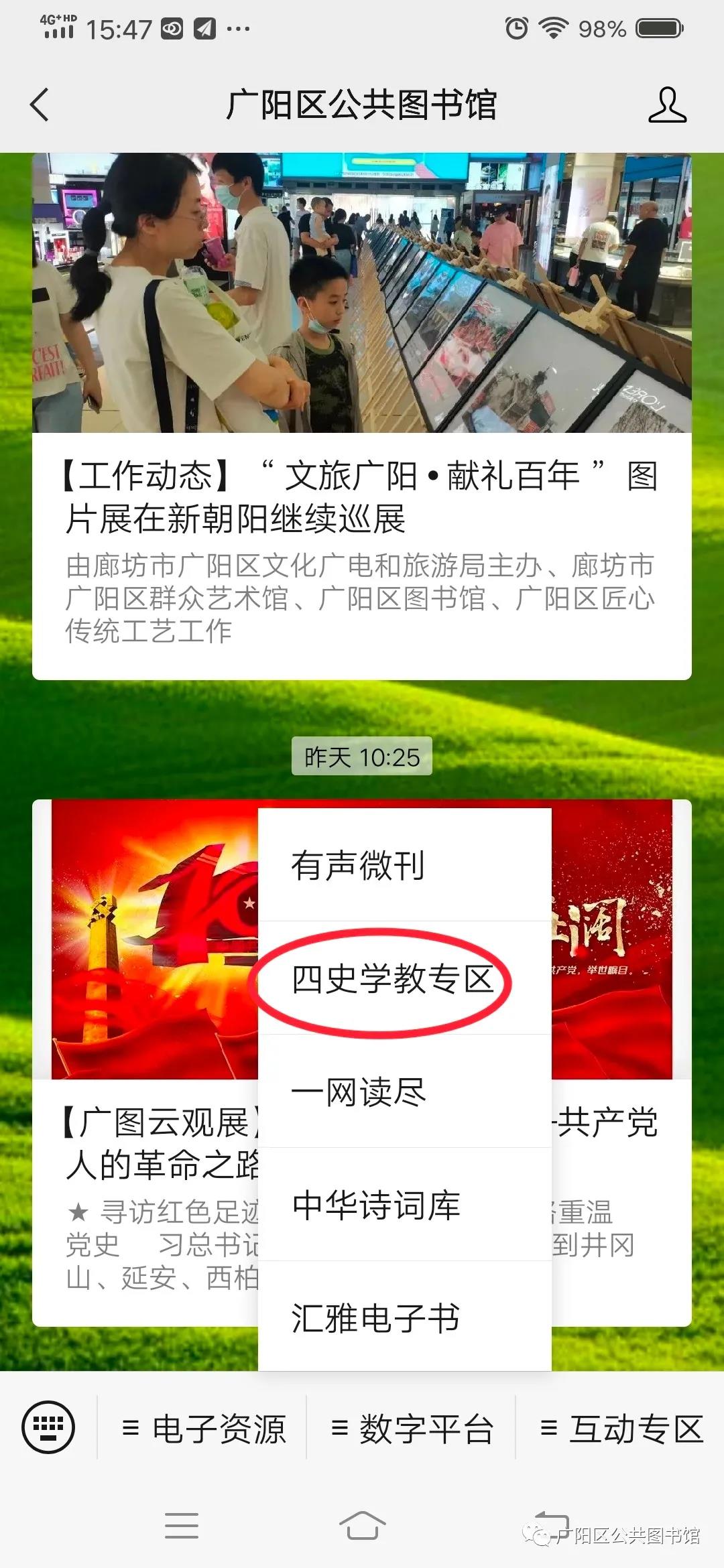 关注广阳区公共图书馆微信公众号,依次点击“数字平台”、“四史学教专区”即可进入该数据库浏览阅读。