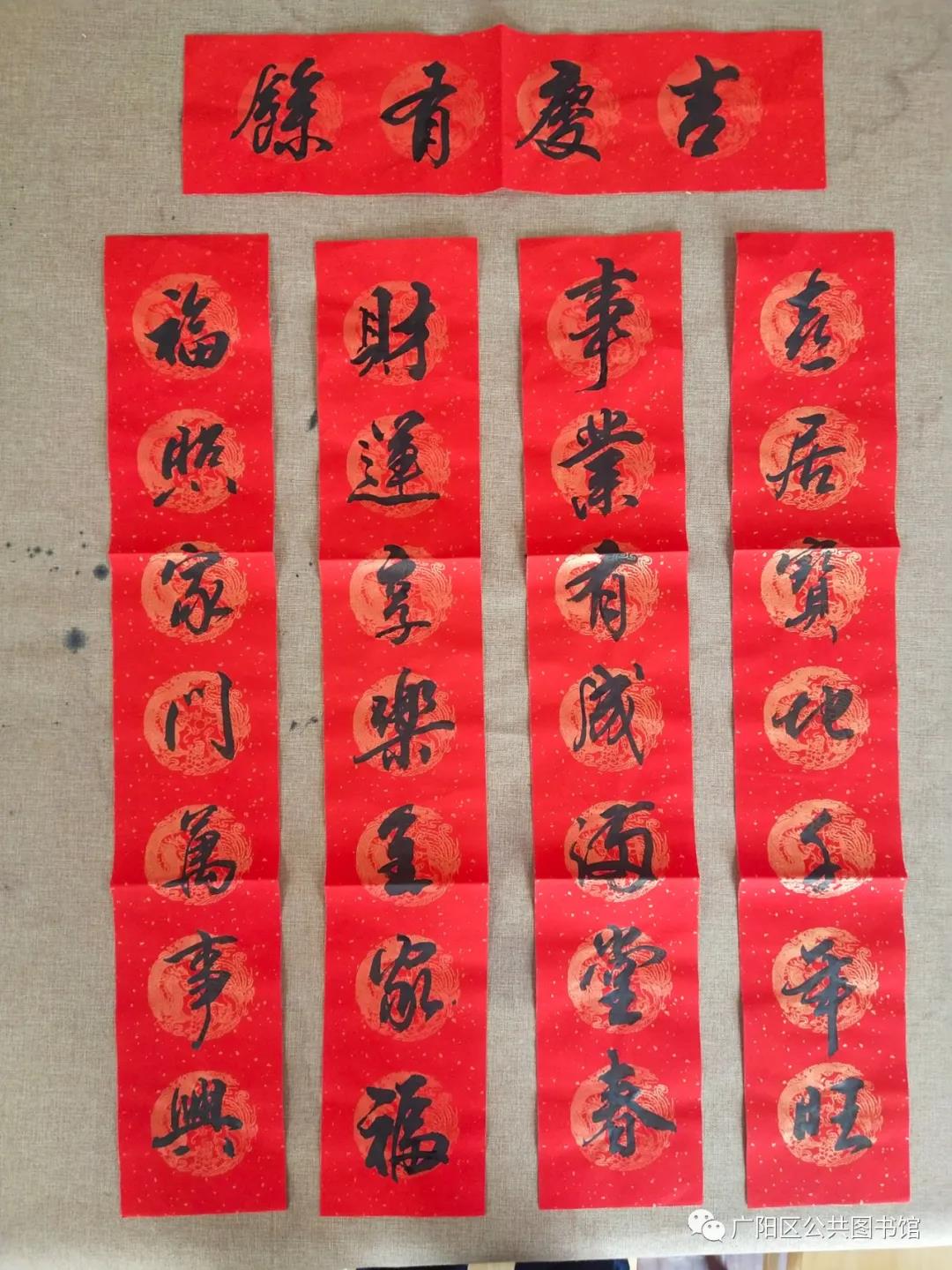 【最新通知】广图到馆送春联活动开始啦! 发布时间:2022-01-21 中华民族传统的节日春节将至,为营造喜庆祥和的节日氛围,弘扬传统民俗文化,吸引更多群众走进图书馆加入到阅读的行列中来,我馆特举办“2022广阳图书馆送春联活动”,所备春联均为廊坊市楹联协会会员老师们手书。从2022年1月22日起,凡到馆借阅和自修的读者,均可凭本人身份证免费领取春联一副(不能重复领取),数量有限,先到先得,送完为止。