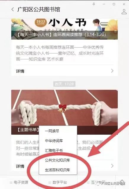 登录方式:关注“广阳区公共图书馆”微信公众号,依次在标签栏点击“数字平台”—“公共文化知识库”或“生活百科知识库”,即可免费使用相关资源。