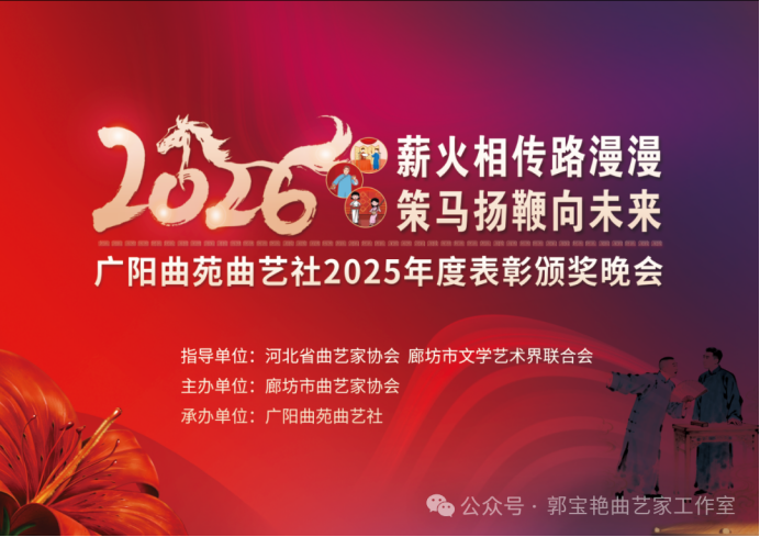 薪火相传,生生不息;策马扬鞭,未来可期。此次表彰晚会的圆满举办,既是对广阳曲苑曲艺社过往成绩的肯定,更是对传统曲艺传承发展的有力推动。在上级部门的持续关怀与扶持下,广阳曲苑曲艺社将继续以郭宝艳曲艺家工作室为阵地,深耕创作、培育新人,让京东大鼓、快板、相声等传统艺术在新时代绽放更绚丽的光彩,为文明城市建设注入源源不断的精神力量!
